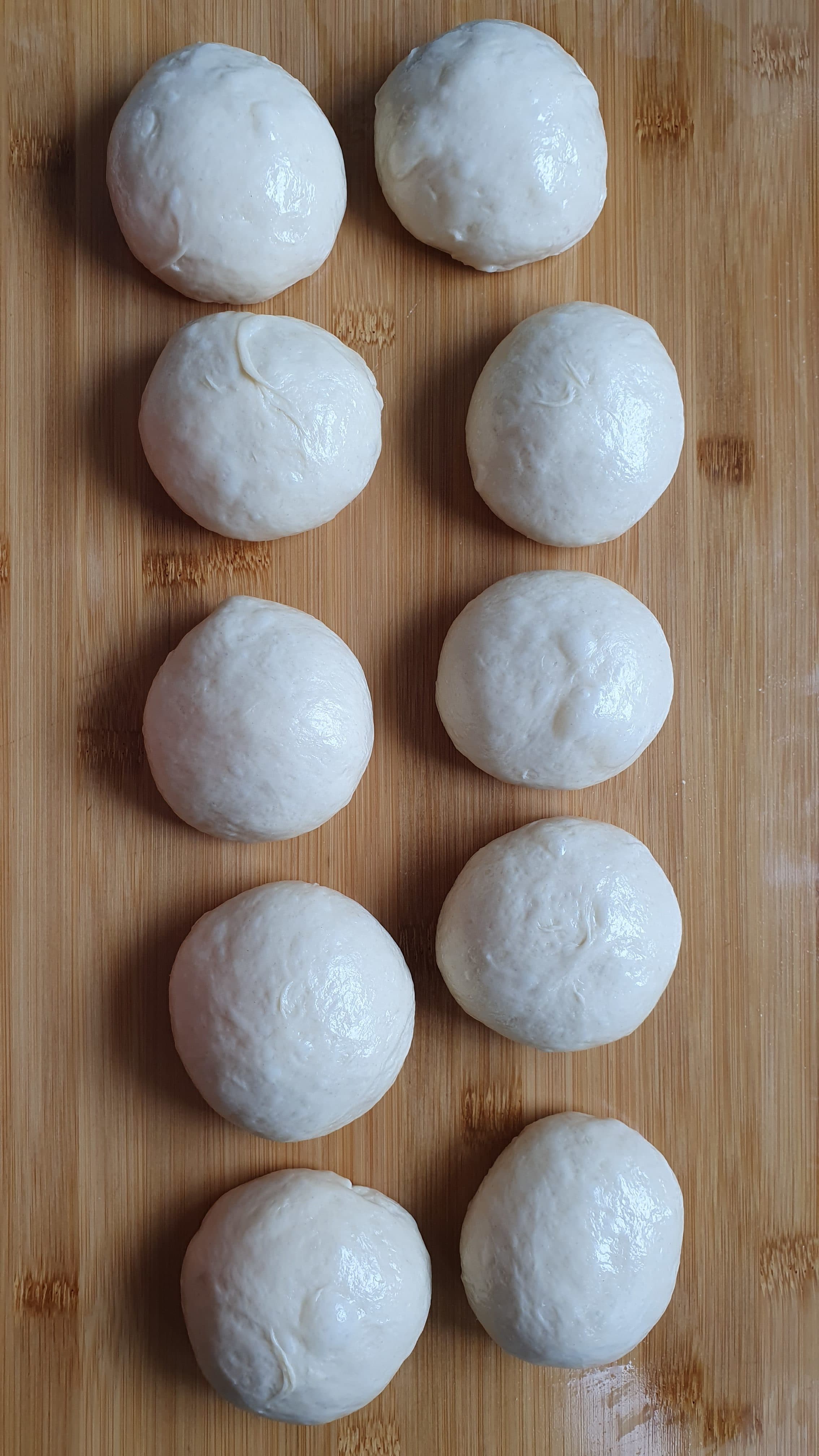 - Den auf der leicht geölten Arbeitsfläche in 10 Teiglinge à ca. 90 g teilen.