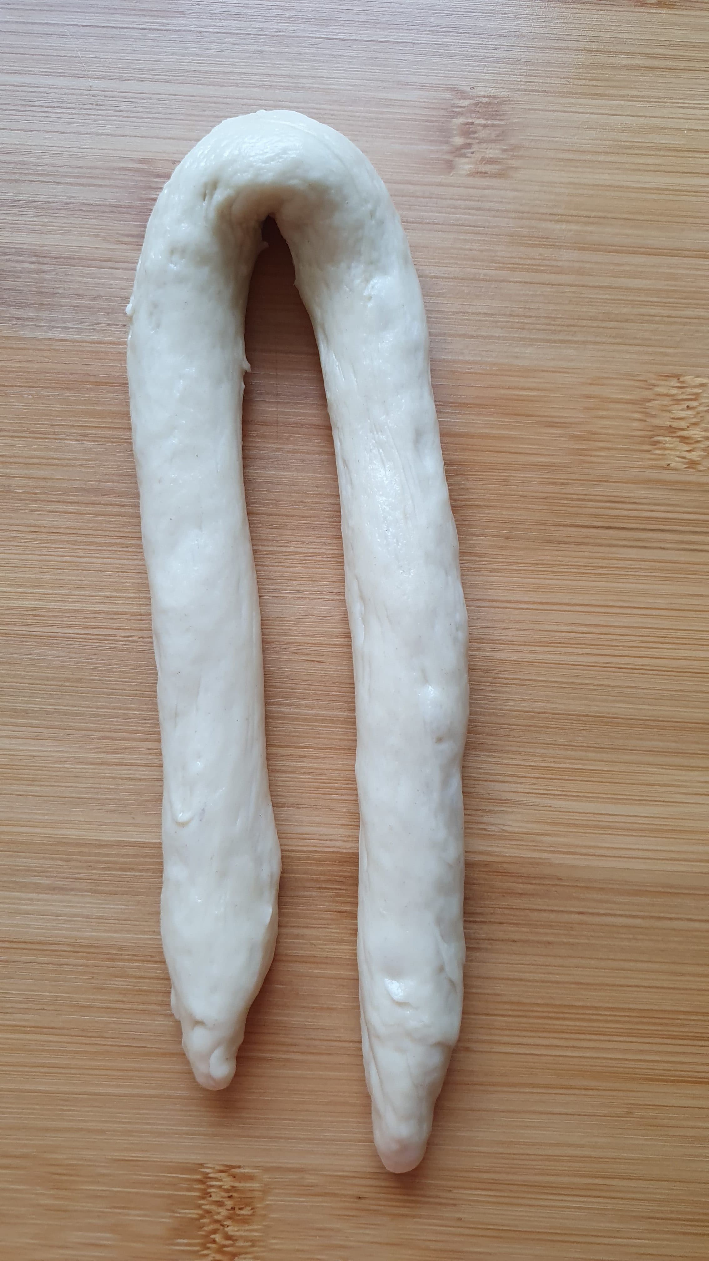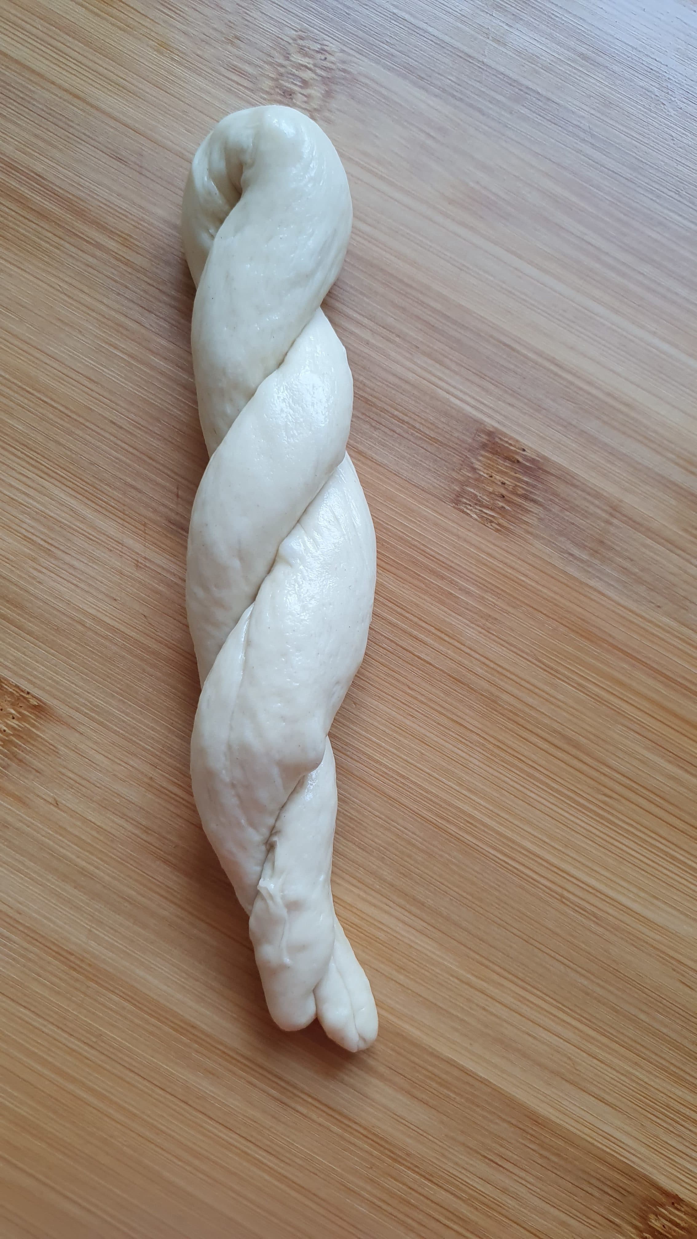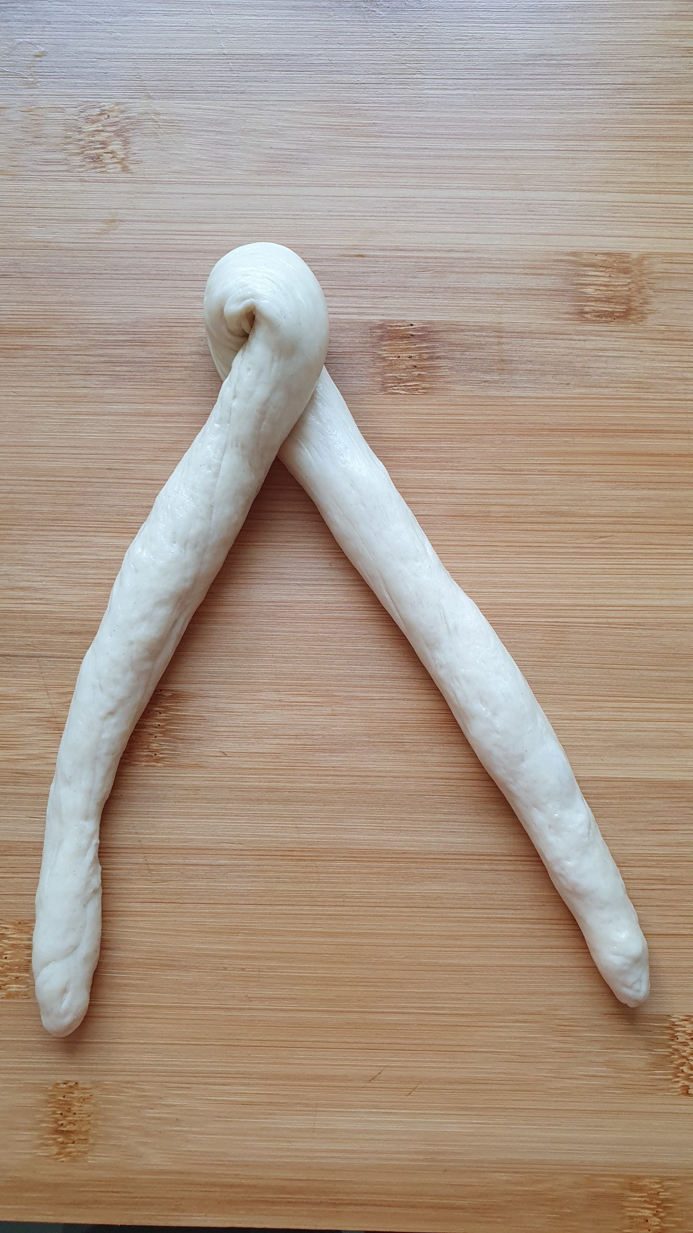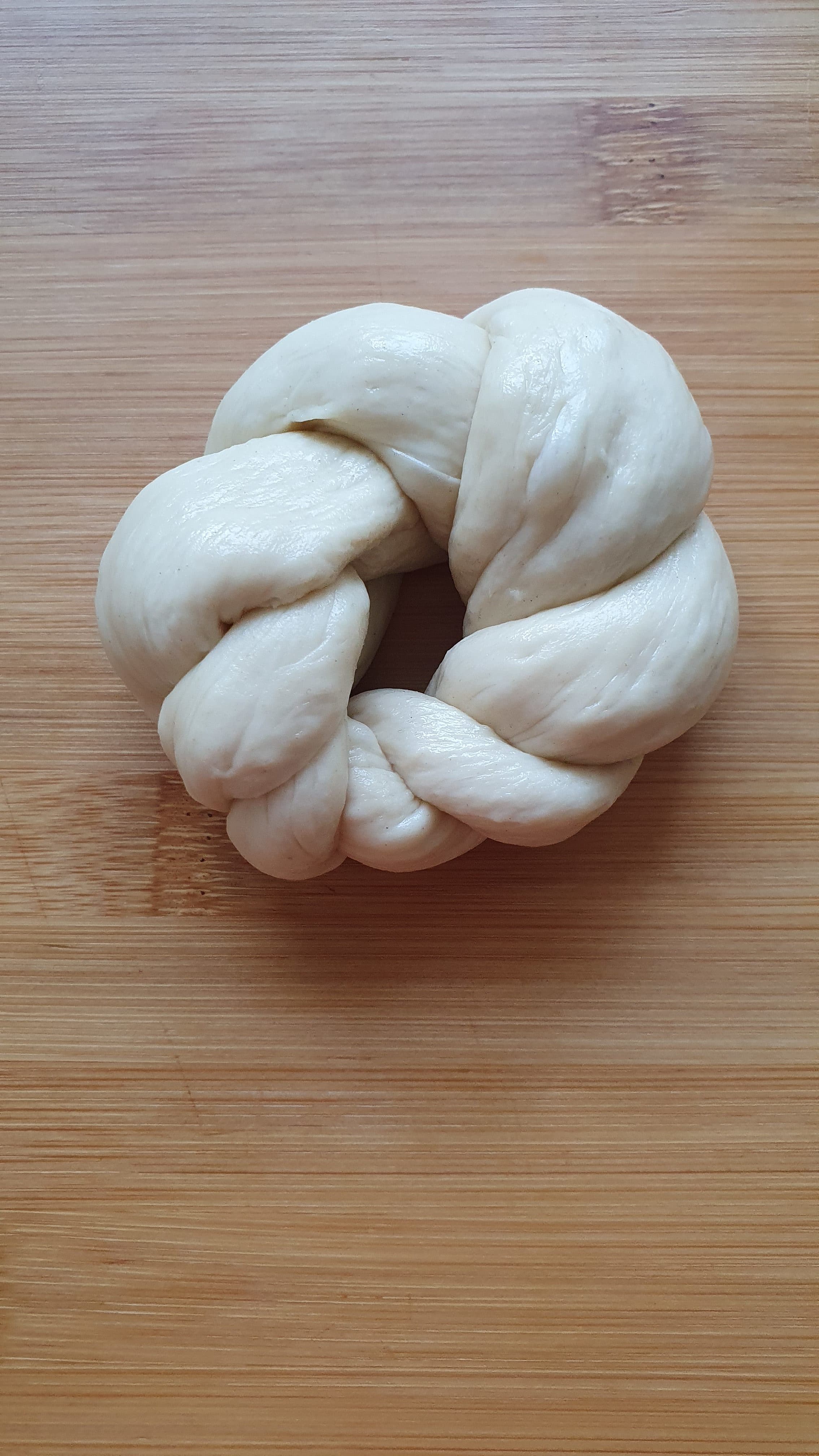 - Die Teigastränge zu einem U legen, kordelartig ineinander verschlingen und zu einem Ring formen.