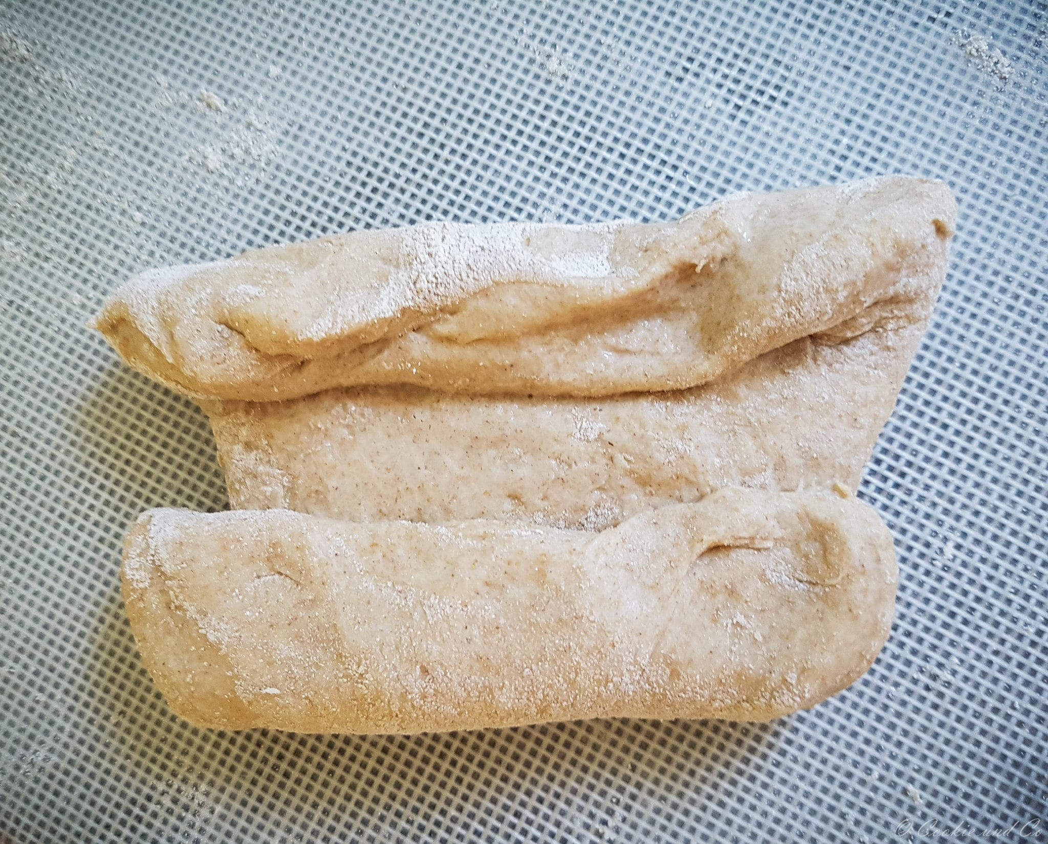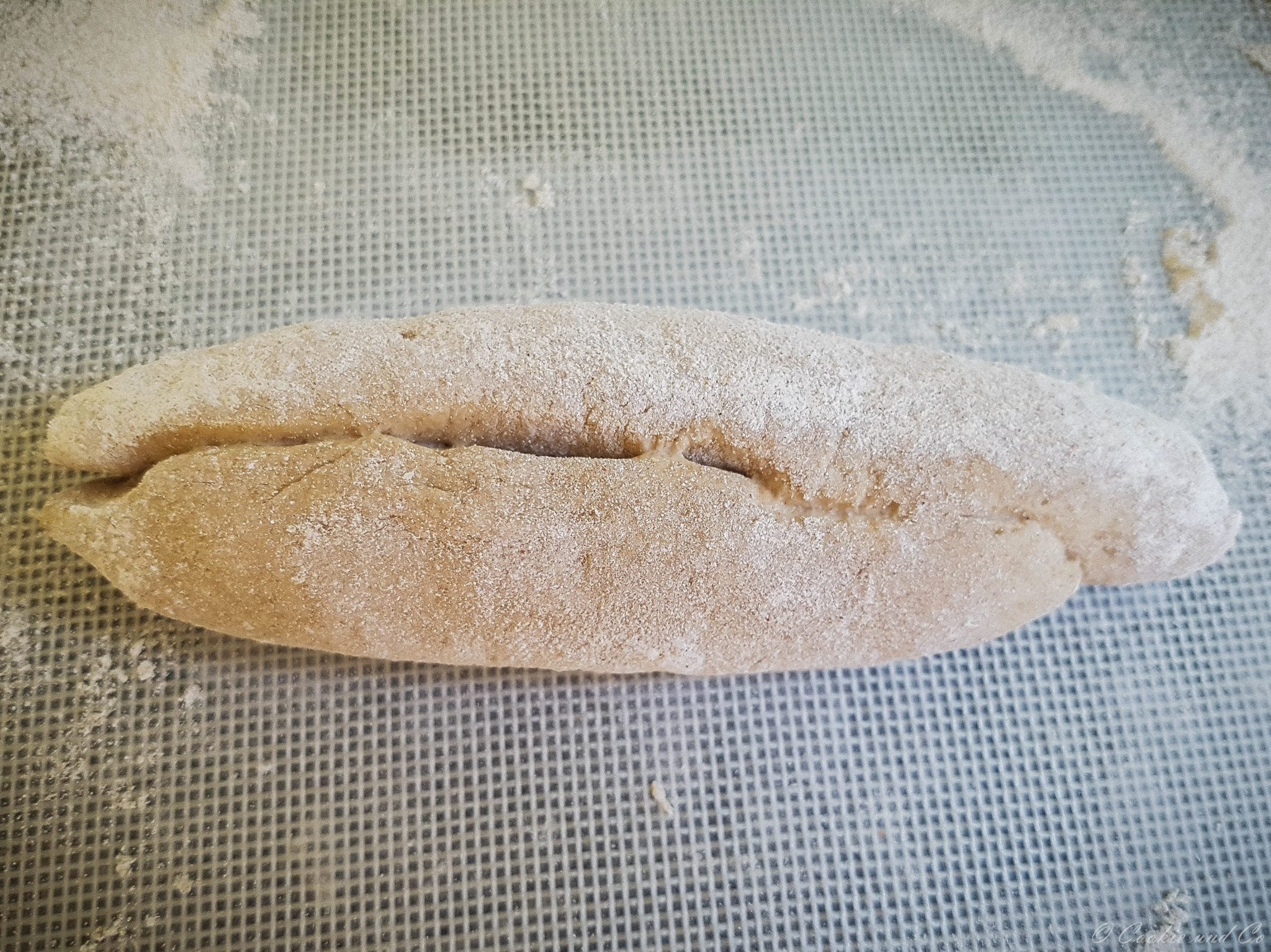 - Diese behutsam mit der Hand etwas flach drücken. Jeweils von 2 Außenseiten her zu Mitte hin aufrollen. Anschließend leicht zusammendrücken und auf der Arbeitsfläche etwas länglich rollen.