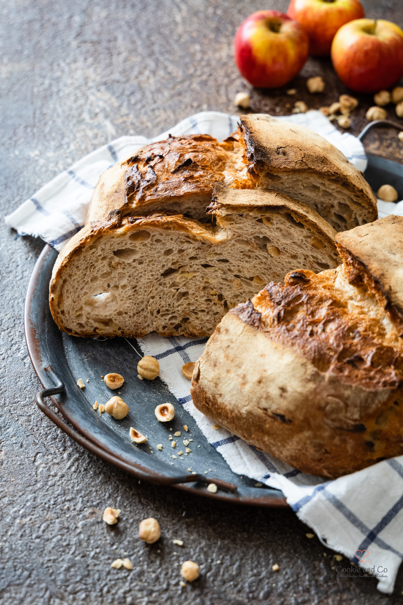 Die Apfel-Nuss-Kruste vereint saftige Krume, rustikales Aroma und eine herrlich nussige Note. Geriebener Apfel sorgt für Fruchtigkeit und langanhaltende Frische, während geröstete Nüsse dem Brot Tiefe und Textur geben. Mit einer langen kalten Teigführung entwickelst du sozusagen im Schlaf komplexe Aromen und genießt am Backtag entspannt ein duftendes Sauerteigbrot. Perfekt für Herbst und Winter – oder das ganze Jahr über.