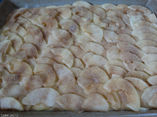 - Die Apfelscheiben schuppenartig auf dem Teig verteilen und