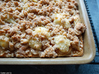 Der Teig unter den Äpfeln ist übrigens relativ fettarm, da er keine zusätzliche Butter enthält. Durch die Äpfel und den Pudding wird der Kuchen trotzdem schön saftig und schlägt mit den vielen Streuseln nicht ganz so zu buche…meistens kommt ja auch noch ein Klecks Sahne mit hinzu.