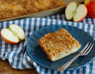 Der Teig unter den Äpfeln ist übrigens relativ fettarm, da er keine zusätzliche Butter enthält. Durch die Äpfel und den Pudding wird der Kuchen trotzdem schön saftig und schlägt mit den vielen Streuseln nicht ganz so zu buche…meistens kommt ja auch noch ein Klecks Sahne mit hinzu.