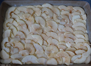 - Die Apfelscheiben schuppenartig auf dem Teig verteilen und