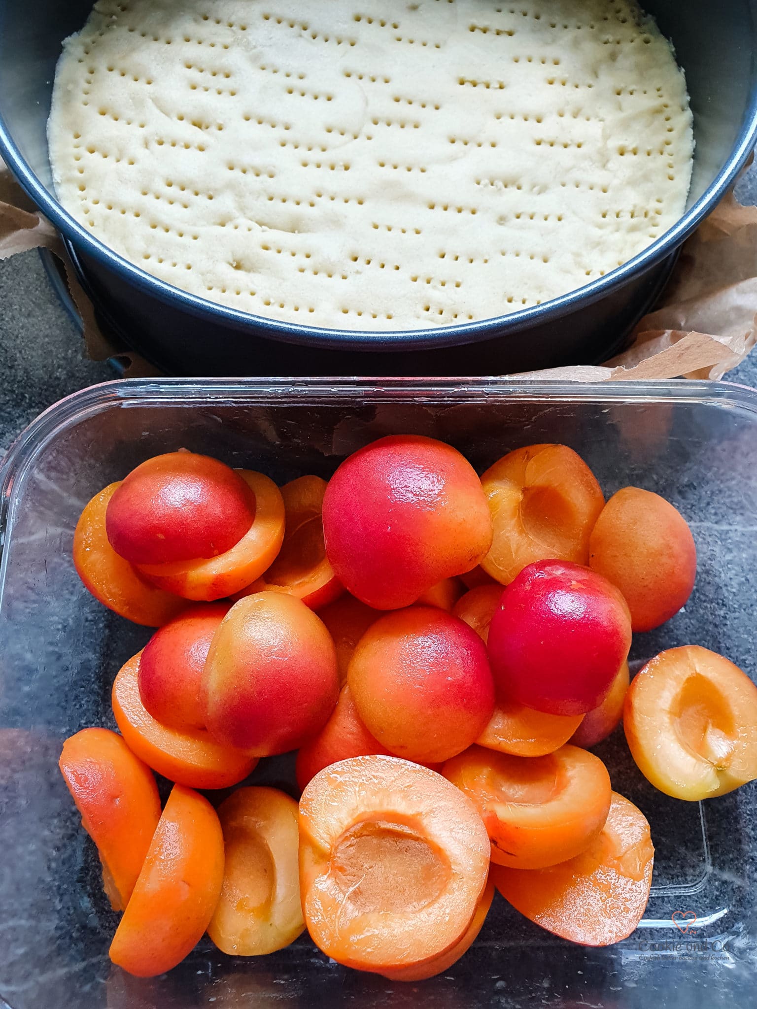 - Etwas von der Füllung auf dem Boden verteilen.Die Aprikosenhälften gleichmäßig darauf verteilen (mit der Rundung nach oben).Anschließen die restliche Füllung auf die Aprikosen geben und glatt streichen.