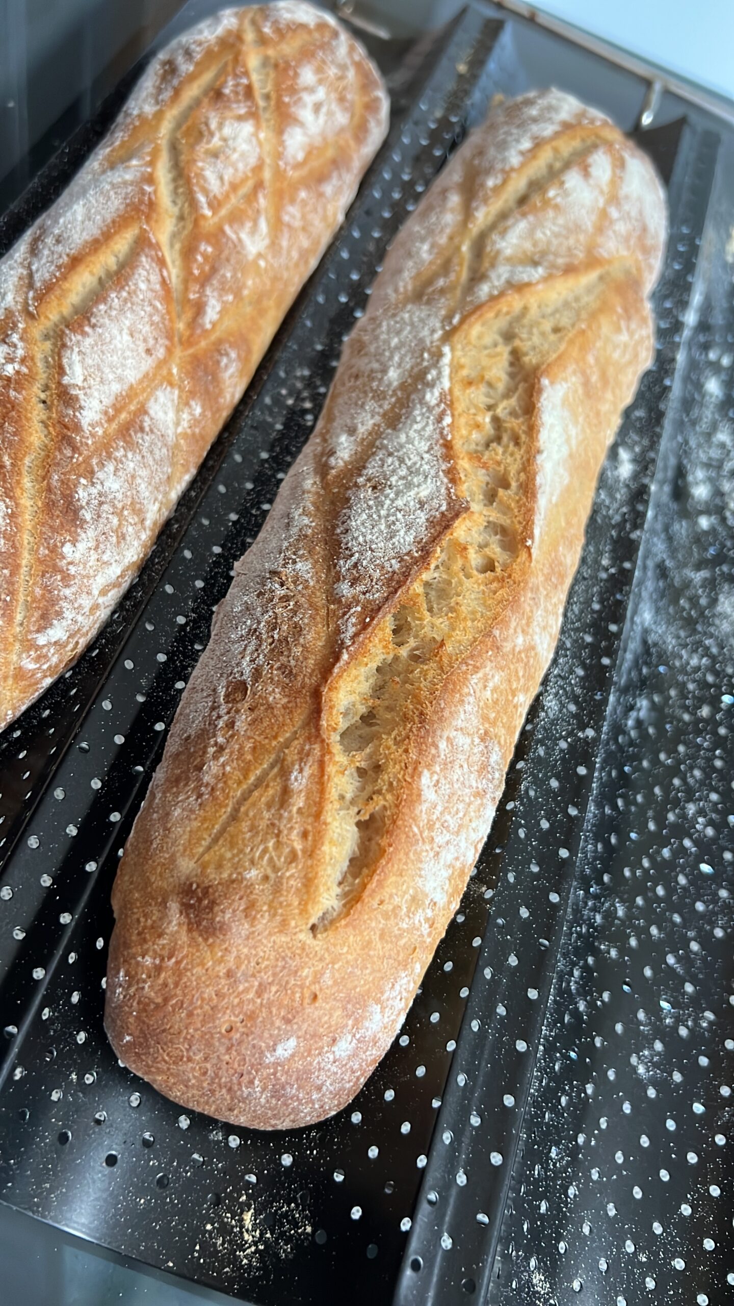 Ich habe sie vorher besprüht, mit Dampf gebacken , nach 10 Minuten den Dampf abgelassen und während der letzten 5 Minuten die Tür ein bisschen offen gelassen. Sie sind auch schon braun geworden und innen gar, aber leider gar nicht knusprig.