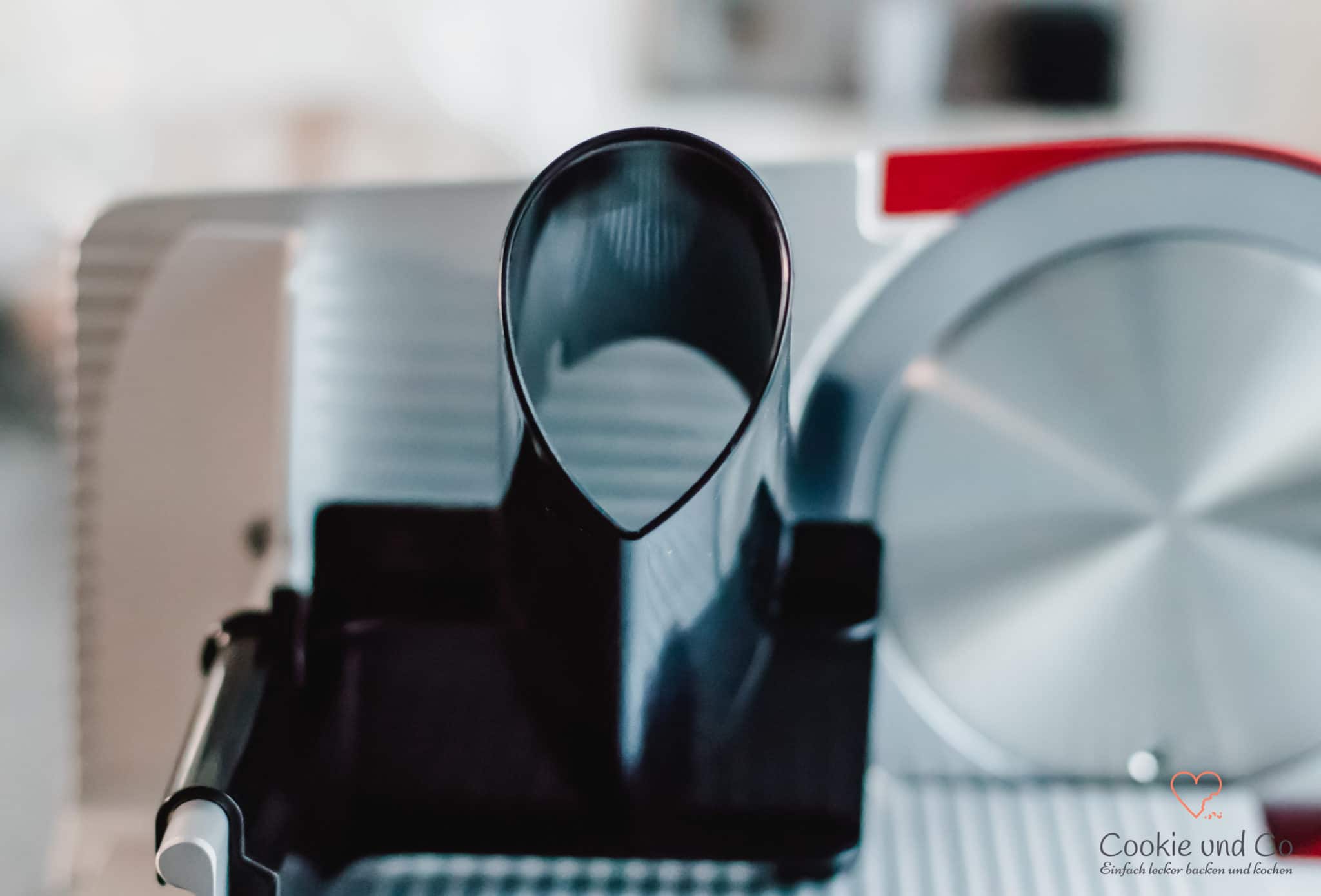…ist oftmals eher der lästige Teil. Was für mich dabei wirklich ganz besonders wichtig ist, dass die Reinigung kinderleicht funktioniert! Das Essen macht halt mehr Spaß, aber es geht hier wirklich super easy und man muss dabei keine Angst um seine Finger haben. Sonst hätte ich auch keine Lust alles ständig selbst frisch aufzuschneiden, wenn das Putzen danach umständlich und aufwendig ist. Man kann die Schnittstärke kleiner als „Null“ einstellen. Damit ist dann das (sauscharfe) Vollstahlmesser ringsherum geschützt. Um das Messer zur gründlichen Reinigung komplett abzunehmen, wird außerdem ein Messerhalter mitgeliefert. Damit kann es zur Reinigung sicher entfernt und später kinderleicht wieder eingesetzt werden.