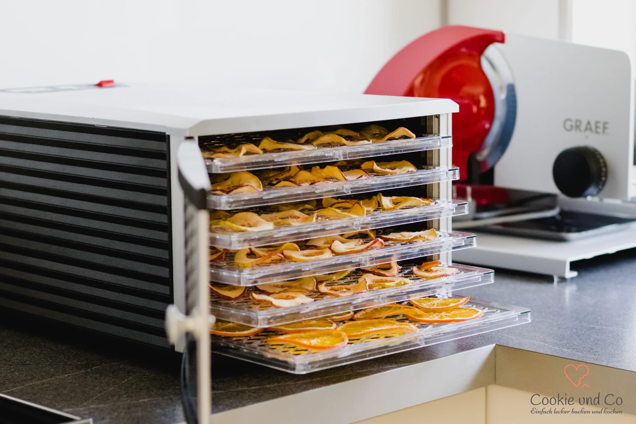 Ich dörre darin super gerne frisches Obst für uns- als gesunden Snack. Aber auch überreifes Obst, das keiner mehr essen mag, kann so prima verarbeitet werden und so vor dem Kompost bewahrt werden. Auch Kräuter und Gemüse lassen sich toll darin trocknen und somit haltbar machen. Ihr wisst was drin ist und braucht weder zusätzlichen Zucker noch Salz für die Konservierung.