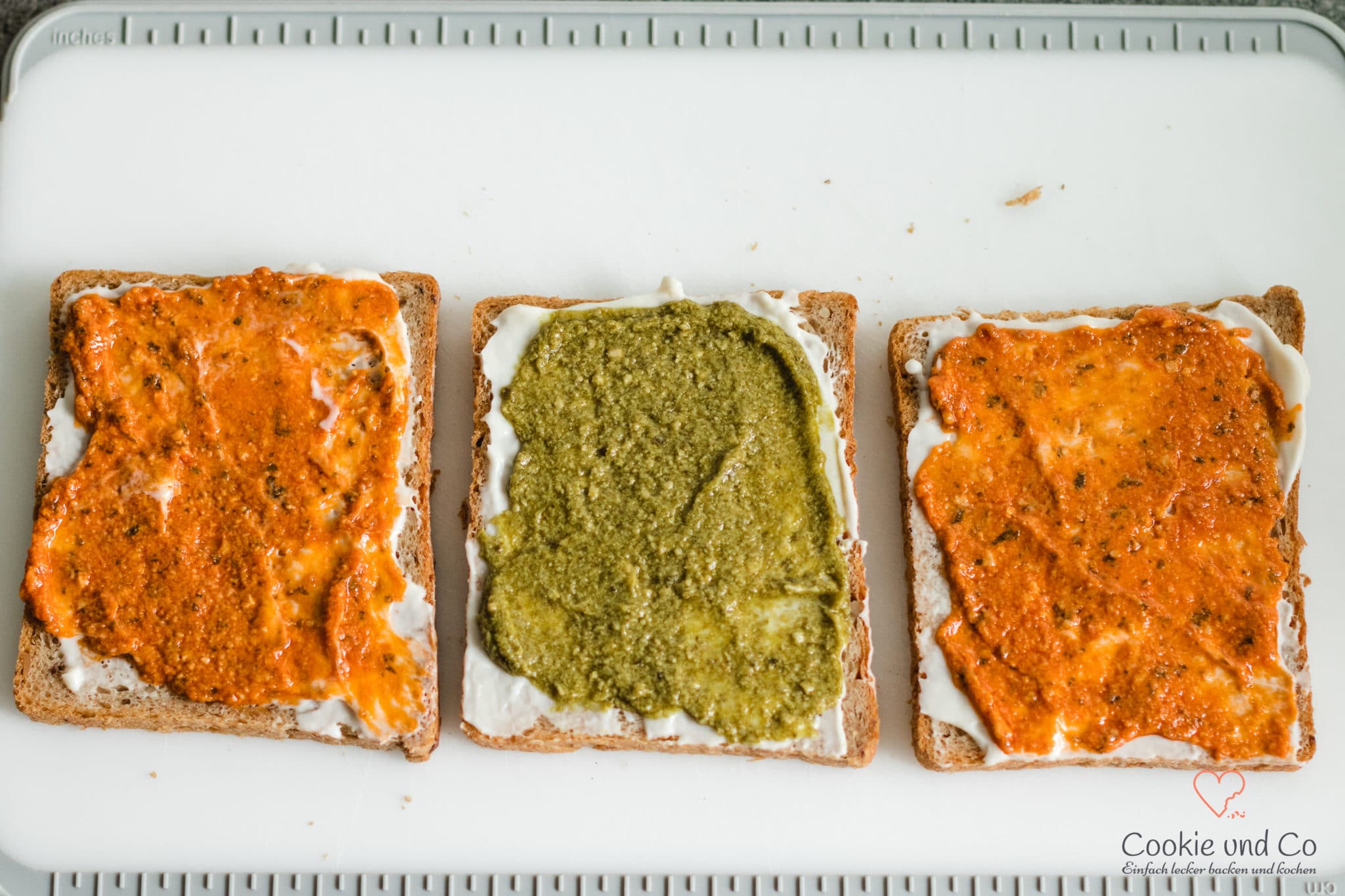 - Toastscheiben an den innen liegenden Seiten jeweils zuerst dünn mit Mayonnaise und danach abwechselnd mit roten und grünem Pesto bestreichen.