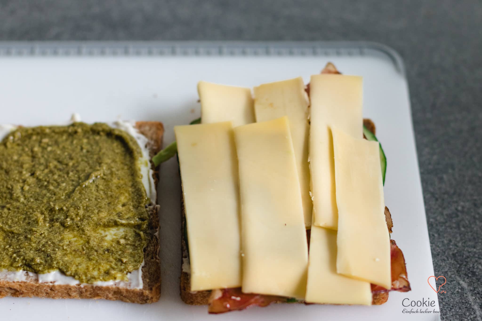 - Die Hälfte des Belags auf je zwei Toastscheiben schichten. Dann kommt eine weitere Toastscheibe (ebenfalls mit Mayo & Pesto bestrichen) und der restliche Belag. Mit den letzten beiden Toastscheiben abschließen.