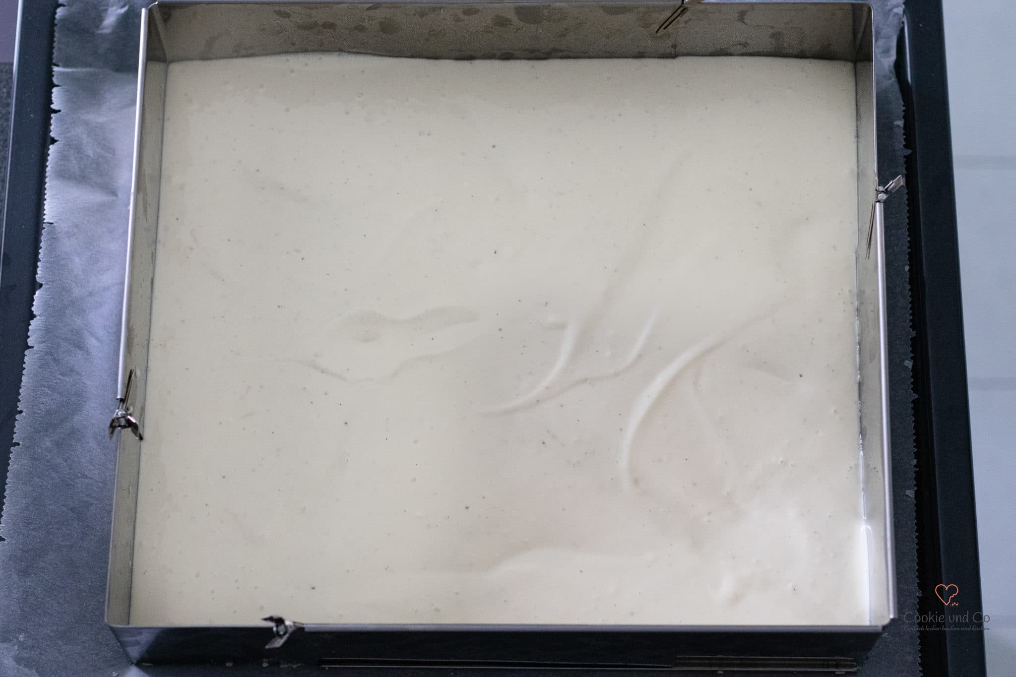 - Für die Füllung Eier, Zucker, ggf. Salz und Vanille schaumig aufschlagen. Quark, Schmand, Frischkäse sowie Zitronenschale und -saft sowie das Puddingpulver hinzugeben und verrühren. Danach vorsichtig die Milch zugeben und unterrühren. Die Masse auf dem Teigboden verteilen.