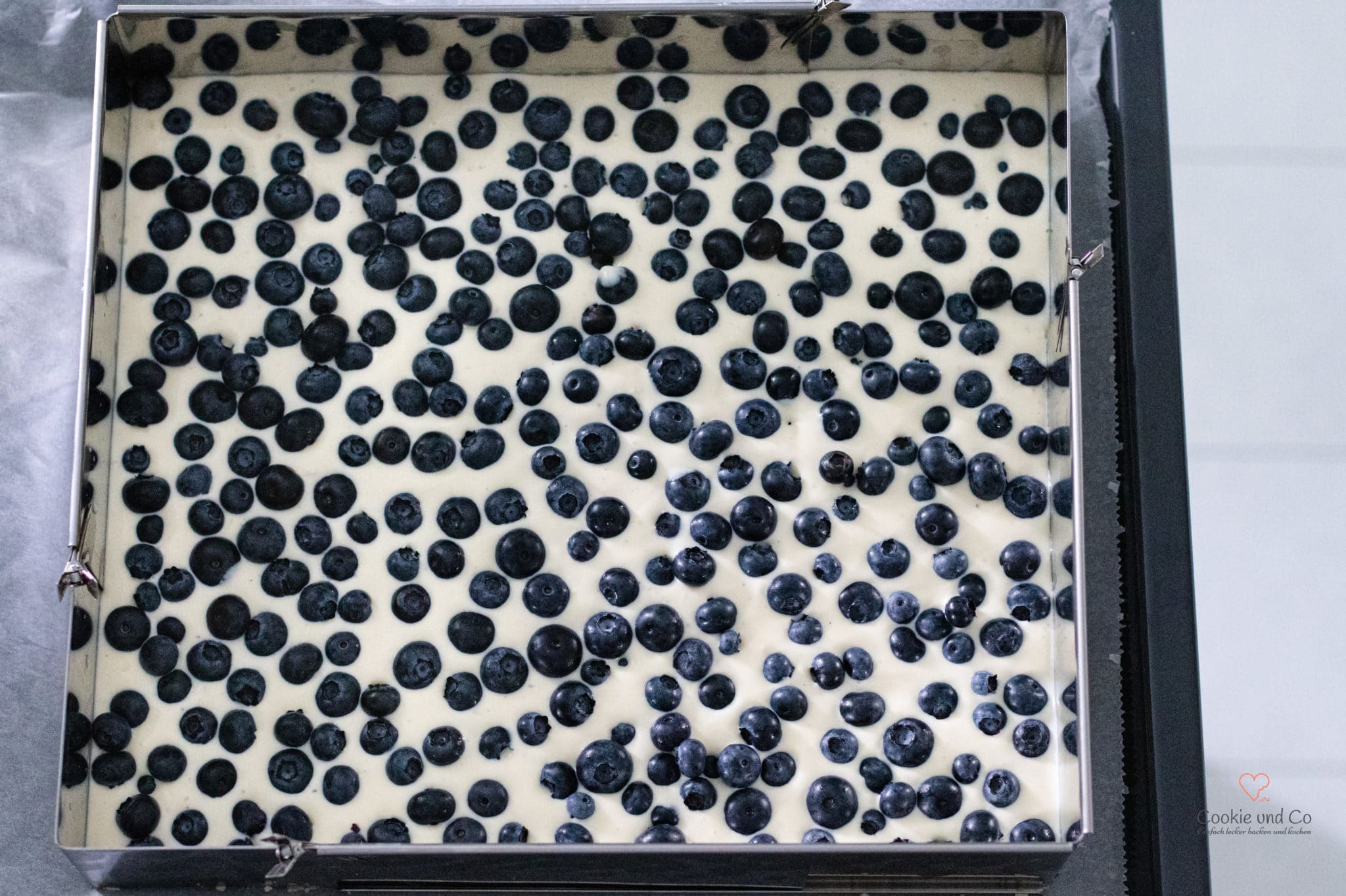 - Zuerst die Heidelbeeren gleichmäßig auf der Quarkmasse verteilen und danach den restlichen Teig darüber krümeln.