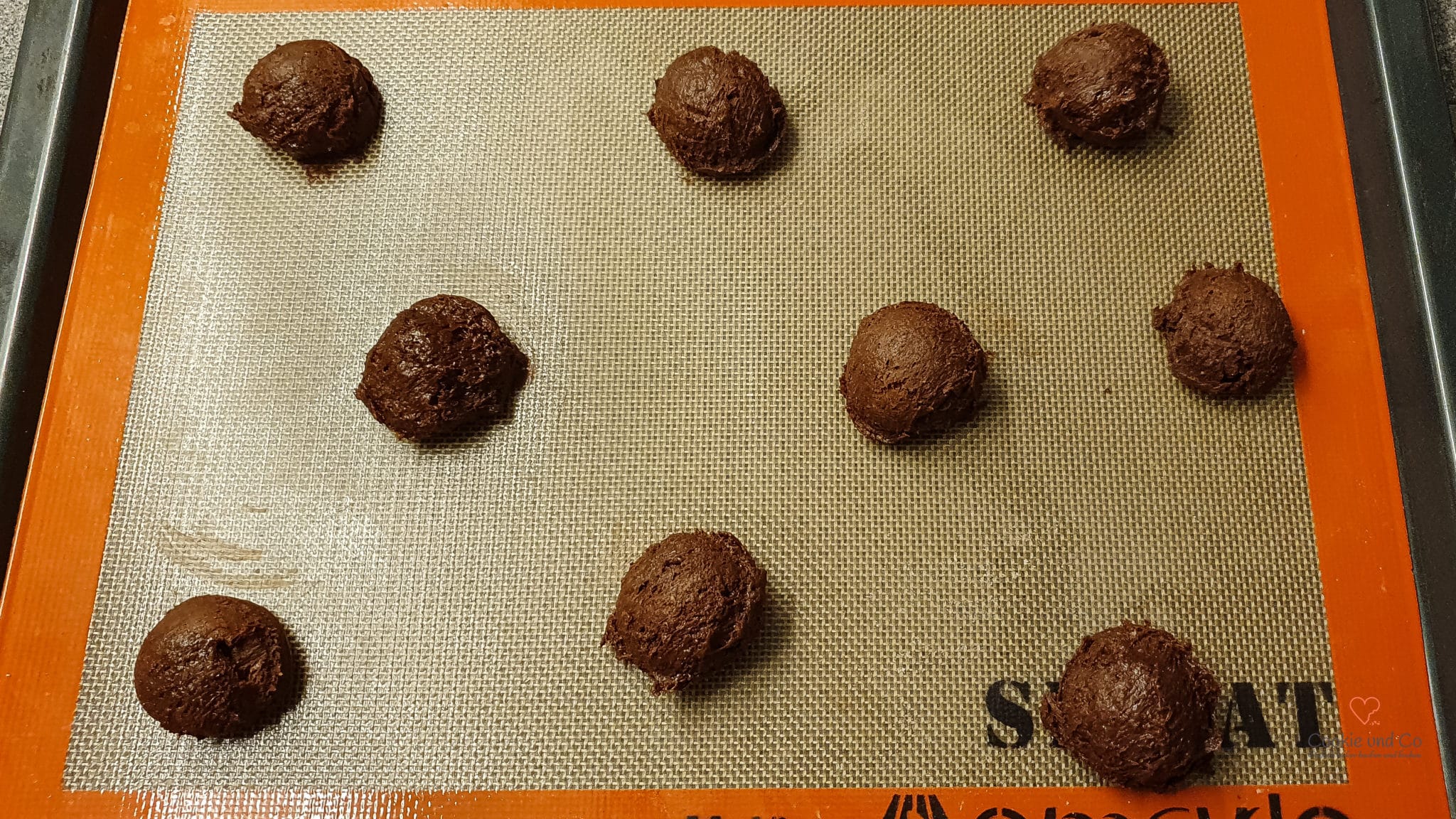- Den Teig mit zwei Teelöffeln und genügend Abstand auf zwei mit Backpapier belegte Bleche portionieren. (Ich benutze dazu sehr gerne einen kleinen Eis-Portionierer.)