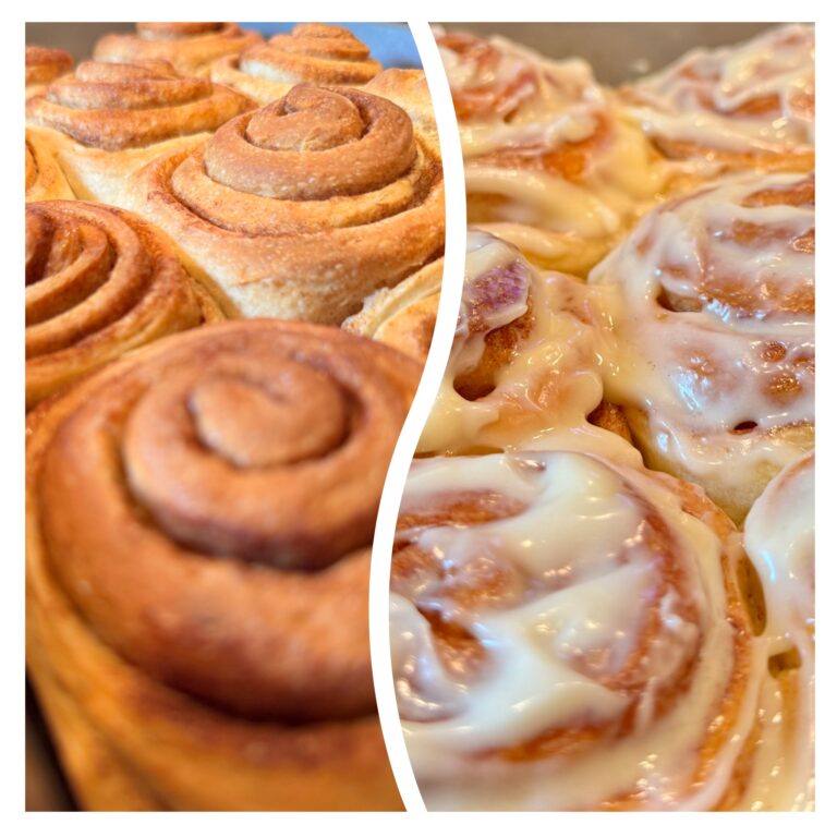 Was macht die amerikanische Zimtschnecken-Version so besonders, und wie unterscheidet sie sich von den klassischen schwedischen Kanelbullar? Schwedische Kanelbullar werden oft zu Knoten oder etwas kleinen Schnecken geformt und mit Hagelzucker bestreut, während amerikanische Cinnamon Rolls meist in große, spiralförmige Schnecken geformt und dicht aneinander gebacken werden. Amerikanische Zimtschnecken sind häufig etwas süßer und in den USA wird zudem oft ein cremiges Frischkäsefrosting verwendet, das den Schnecken eine zusätzliche süße und cremige Note verleiht. Kanelbullar enthalten überwiegend Kardamom im Teig und/oder in der Zimtfüllung, was ihnen ein würzigeres und leicht herbes Aroma verleiht.