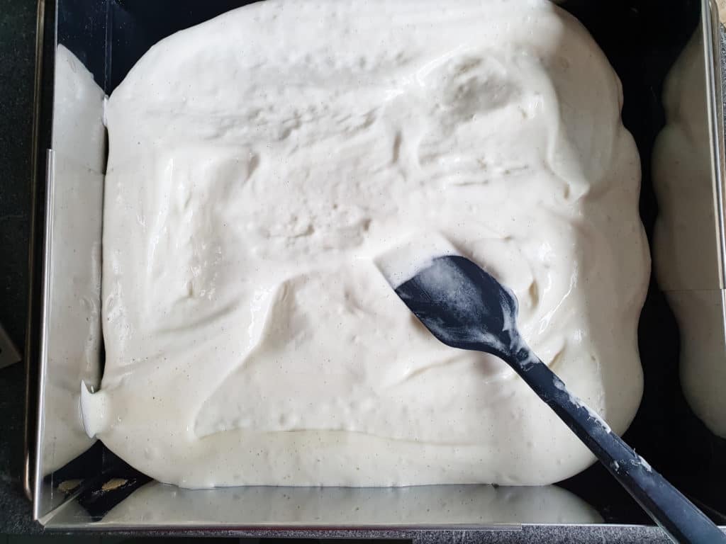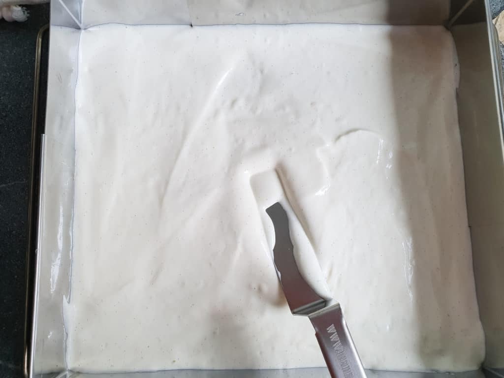 - Backblech mit Backpapier belegen. Nach Wunsch einen eckigen Backrahmen* raufsetzen.