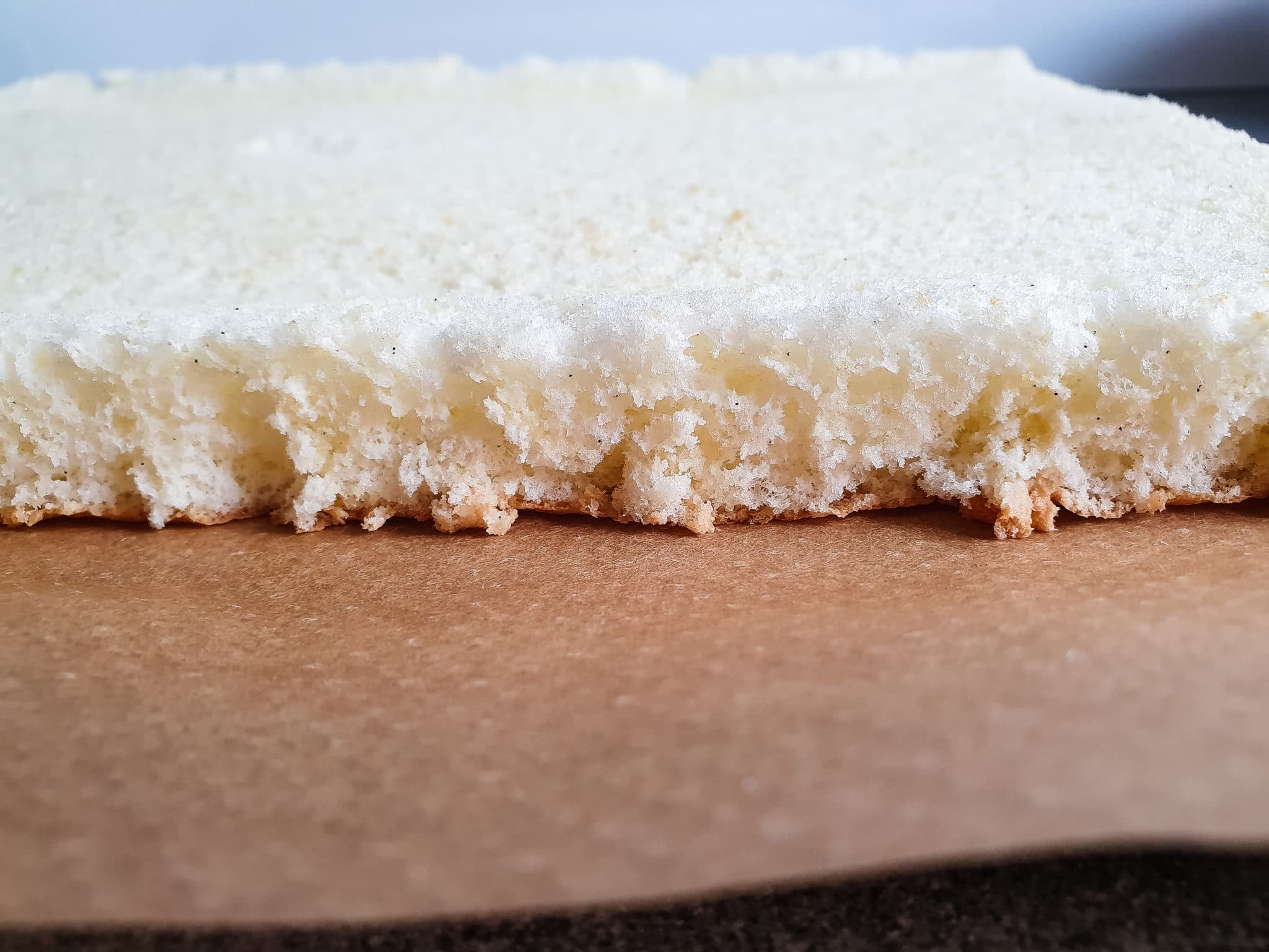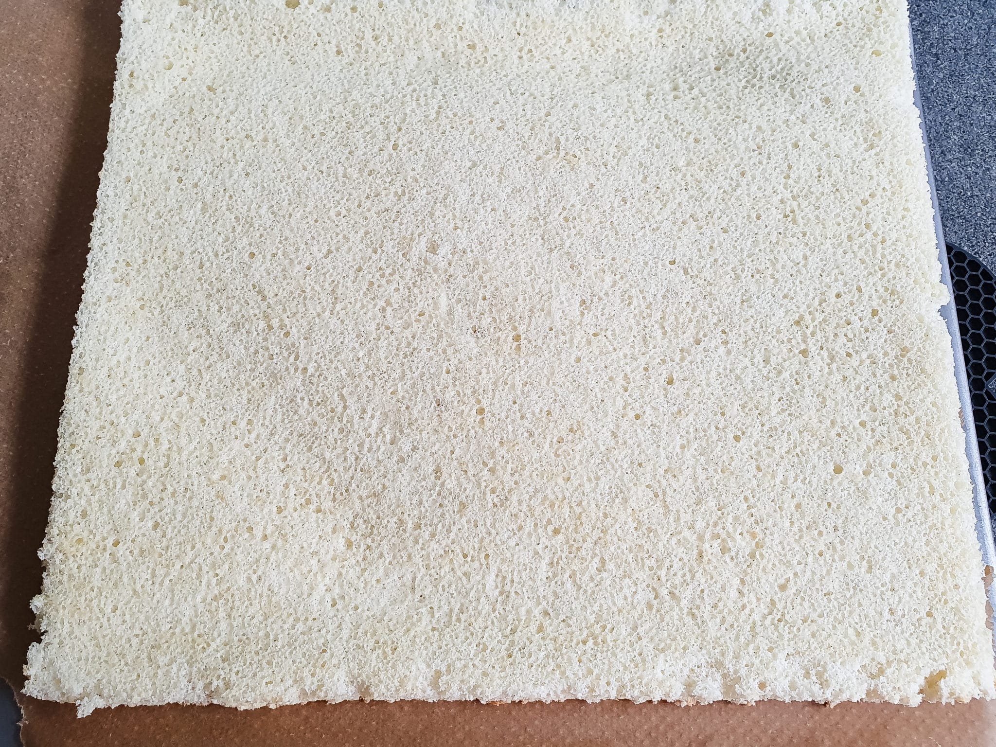 - Biskuitteig auf das vorbereitete Blech streichen. Im vorgeheizten Ofen für ca. 10−14 Minuten backen. Der Teig sollte nach dem Backen noch elastisch sein und leicht zurück federn, wenn man mit dem Finger drauf tippt. (Lieber etwas knapper als zu lang, damit der Biskuit später elastisch ist beim einrollen.)