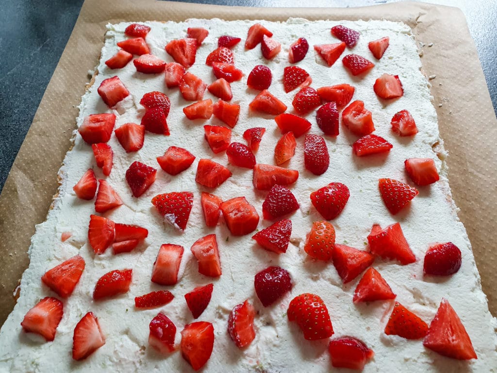 - Die Quark-Sahne-Creme auf dem Biskuit verstreichen, dabei am oberen Rand etwa 3 cm frei lassen.Anschließend die Erdbeeren gleichmäßig darauf verteilen.