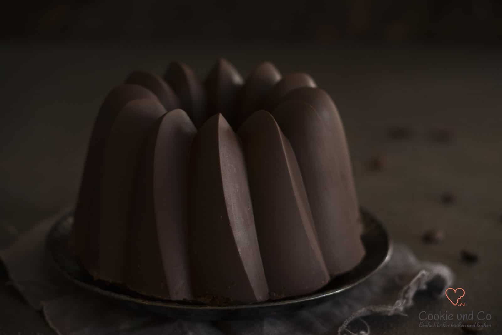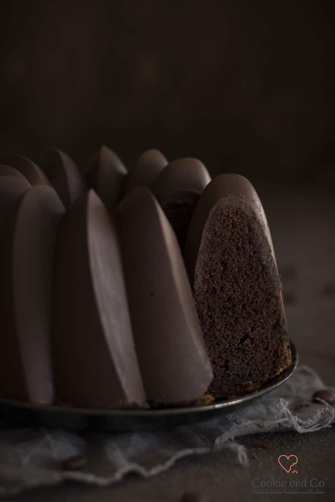 Für die schöne glatte Schokoladenglasur benötigt ihr allerdings eine Silikon-Backform. Denn ohne klappt diese Art von Schokoladenglasur leider nicht. Ich habe übrigens diese Silikon-Gugelhupfform verwendet. Die Schokoladenmenge macht den Kuchen zwar ziemlich mächtig, aber auch mächtig lecker! An der Schokolade nicht zu sparen ist auch einfach wichtig, um diese schöne glatte und gleichmäßige Optik hinzubekommen. Wenn ihr aber keine Silikon-Gugelhupfform besitzt, dann könnt ihr den Kuchen auch einfach in einer gängigen Gugelhupfform backen. Dann einfach die Schokoladenmenge etwas reduzieren und den Gugelhupf damit „normal“ überziehen.