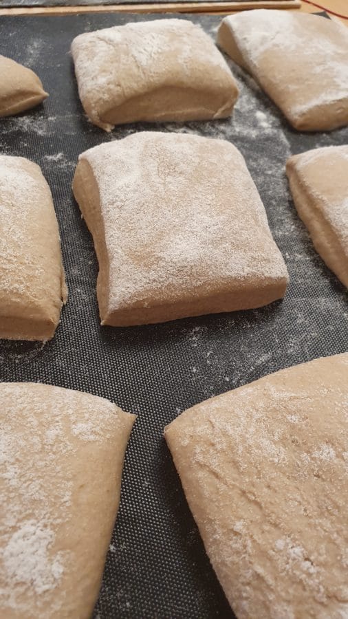 - Auf der bemehlten Arbeitsfläche 9 Teiglinge abstechen