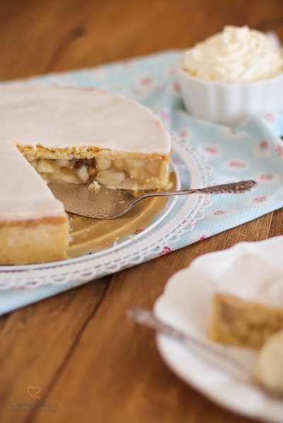 - Die gedeckte Apfeltorte nach Oma`s Art mit dem Zuckerguss überziehen.