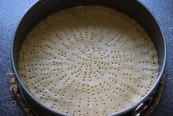 - 1/3 des Teiges auf dem Boden der Springform ausrollen oder einfach mit der flachen Hand gleichmäßig andrücken. Mehrmals mit einer Gabel einstechen. Für etwa 10-12 Minuten vorbacken.