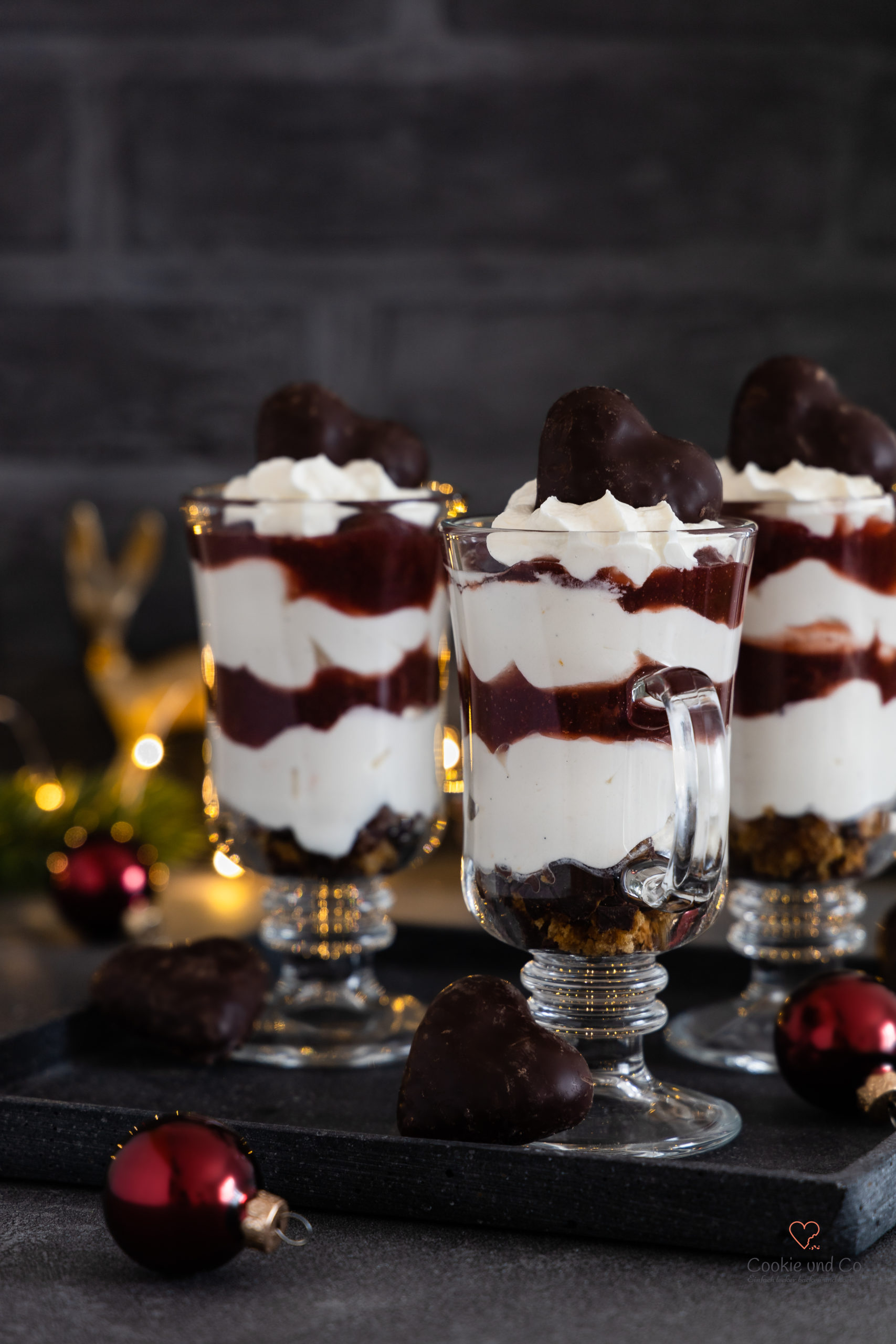 Dieses Schichtdessert besteht aus einer leckeren Quark-Schmand-Creme, die abwechselnd mit einer aromatischen Glühwein-Kirsch-Soße auf einem zerbröseltem Lebkuchenherz geschichtet wird. Die Soße verfeinere ich übrigens sehr gerne mit etwas Amaretto. Für die Kinder bereite ich die Soße dann einfach nochmal in der alkoholfreien Variante mit Kirschsaft zu (geht ja zum Glück ruckzuck).