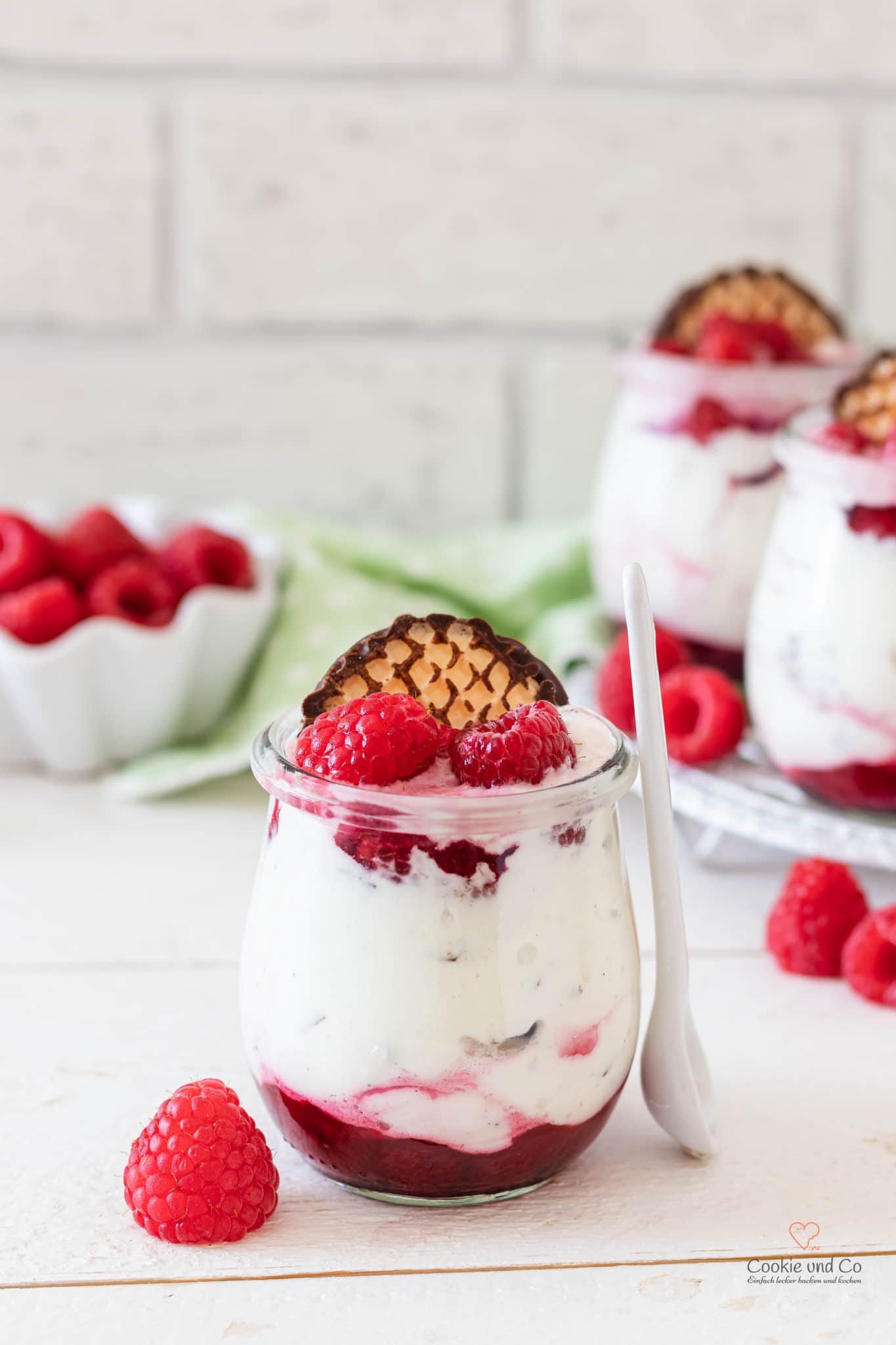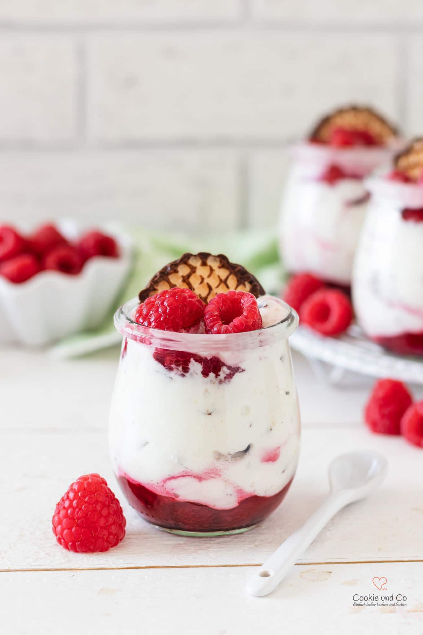 - Die Creme in die Gläser verteilen.Die restlichen Himbeeren ebenfalls gleichmäßig aufteilen und wieder jeweils mit 1 Tl Himbeersirup beträufeln.