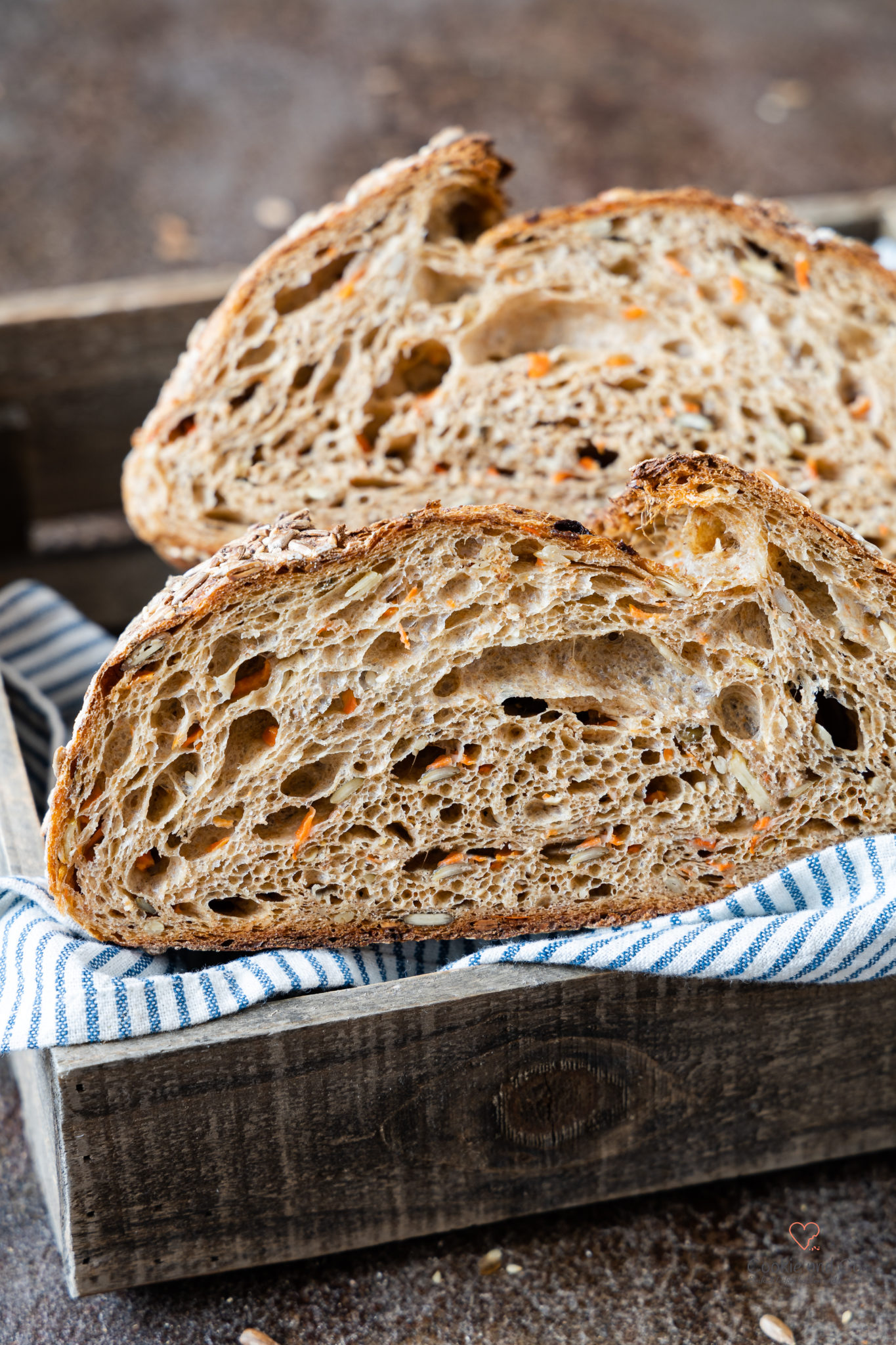 Heute habe ich ein neues Brot Rezept für dich. Ein sehr saftiges, aromatisches und rund um leckeres Brot: meine Karotten-Körner-Kruste. Der Brotlaib besteht zur Hälfte aus Vollkornmehl in Form von Dinkel und Emmer. Außerdem sind Möhren, viele Saaten und Flocken enthalten. Trotzdem wird die Krume wunderbar locker und bleibt lange frisch…♥