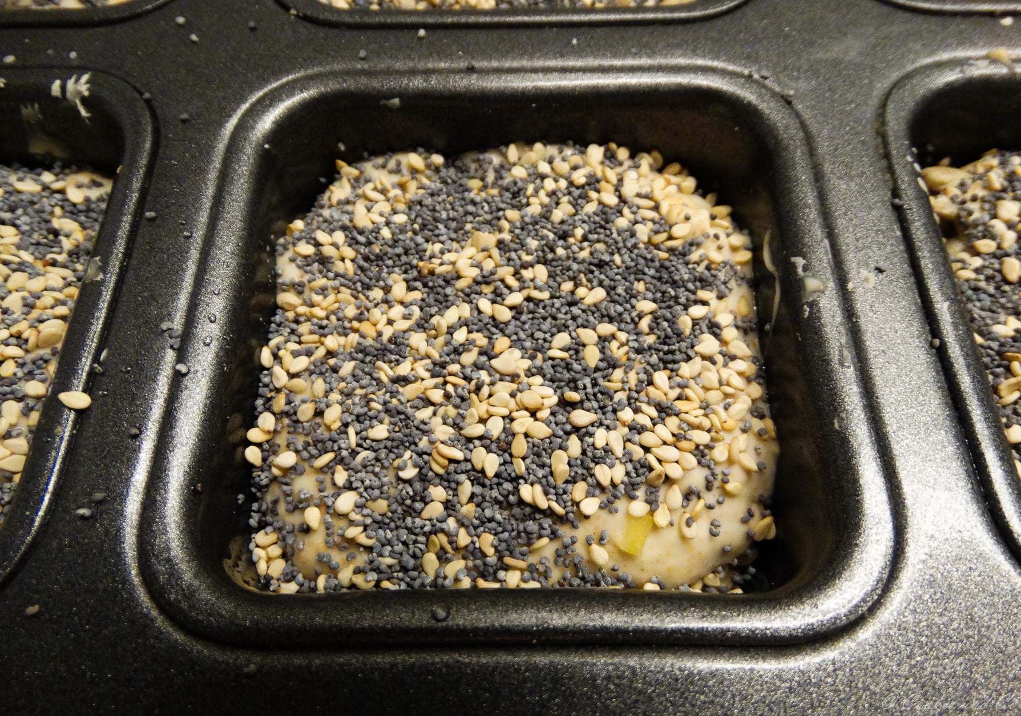 - Teig glätten und bestreuen: Glätte den Teig mit einem leicht angefeuchteten Teigschaber und bestreue ihn großzügig mit Mohn und Sesam.