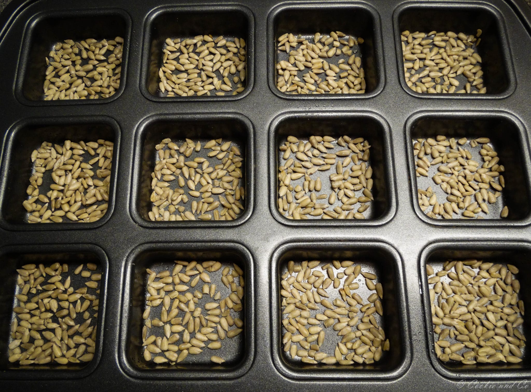 - Vorbereitung der Backform: Fette eine Brownie-Backform oder eine Muffinform leicht ein und streue sie mit Sonnenblumenkernen aus.