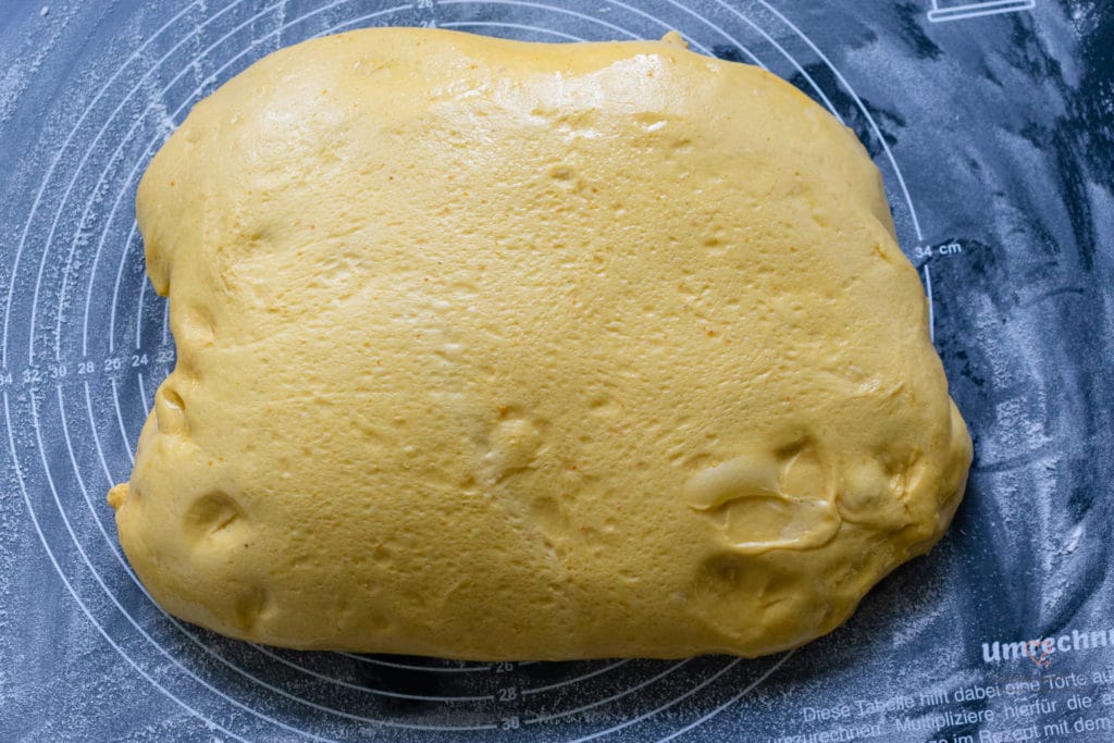 - Nochmal für etwa 90–120 Minuten gehen lassen. In dieser Zeit den Ofen auf 180 °C Ober-/ Unterhitze (160 °C Heißluft/ Umluft) vorheizen.