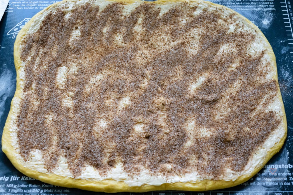 - Die weiche Butter gleichmäßig auf dem ausgerollten Teig verteilen. Gewürze, Zucker und Salz vermischen und gleichmäßig darüber streuen.