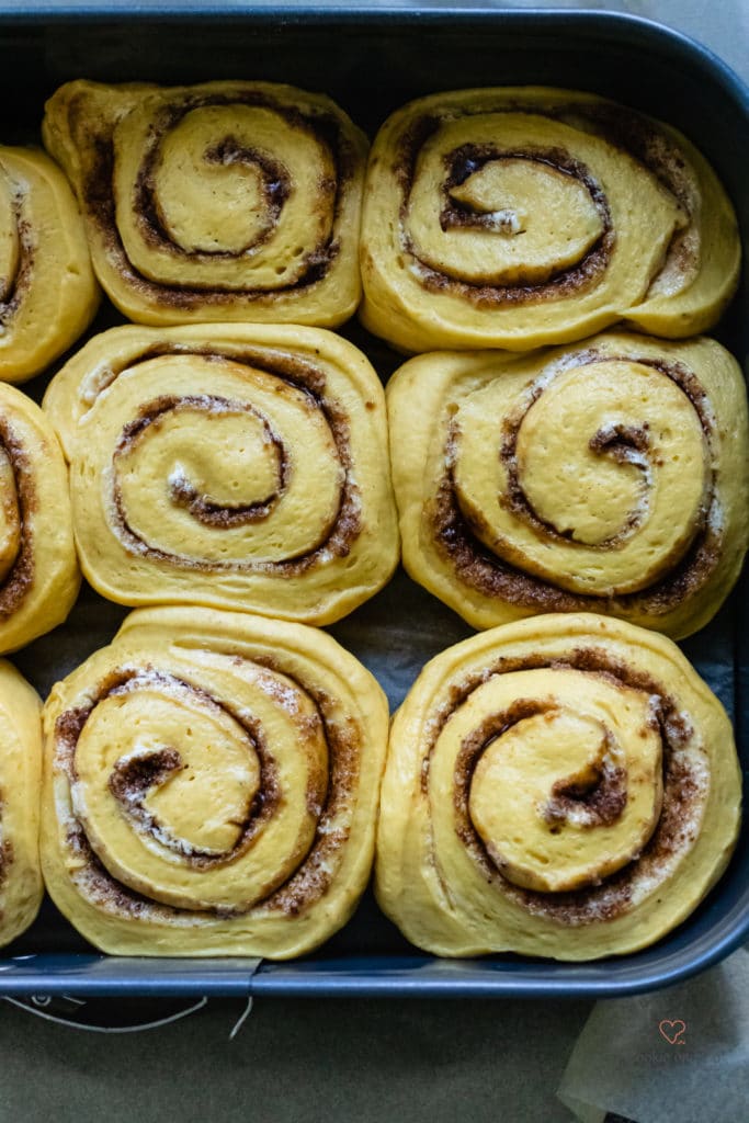 Mit dem Teig und dem Geschmack bin ich jedenfalls mehr als zufrieden … und keine Sorge, den Kürbis schmeckst du nicht wirklich heraus, aber er macht den Hefeteig schön saftig und so bleiben diese Kürbis-Zimtschnecken locker für 2–3 Tage frisch. Also: absolute Nachbackempfehlung! ♥