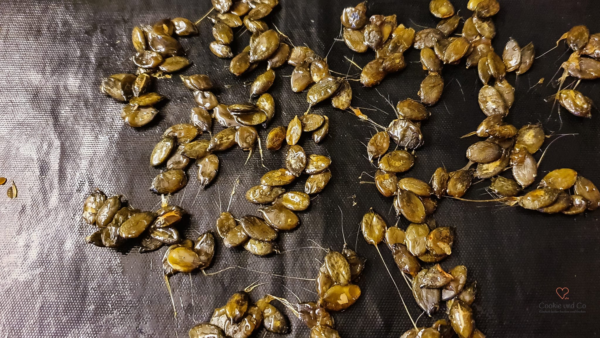 - Kürbiskerne anschließend auf einen Bogen Backpapier/Dauerbackfolie geben und mit zwei Gabeln rasch voneinander trennen.Komplett auskühlen lassen.