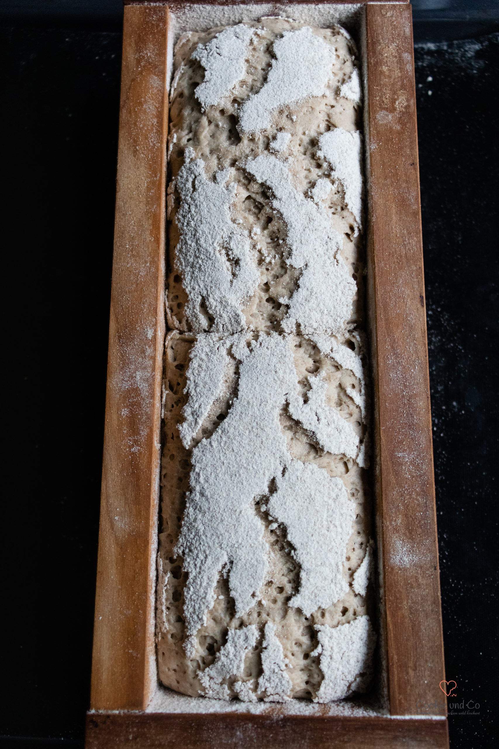 - Anschließend für 20–30 Minuten ruhen lassen.Derweil den Holzbackrahmen oder Kastenform(en) gut einfetten und bemehlen.