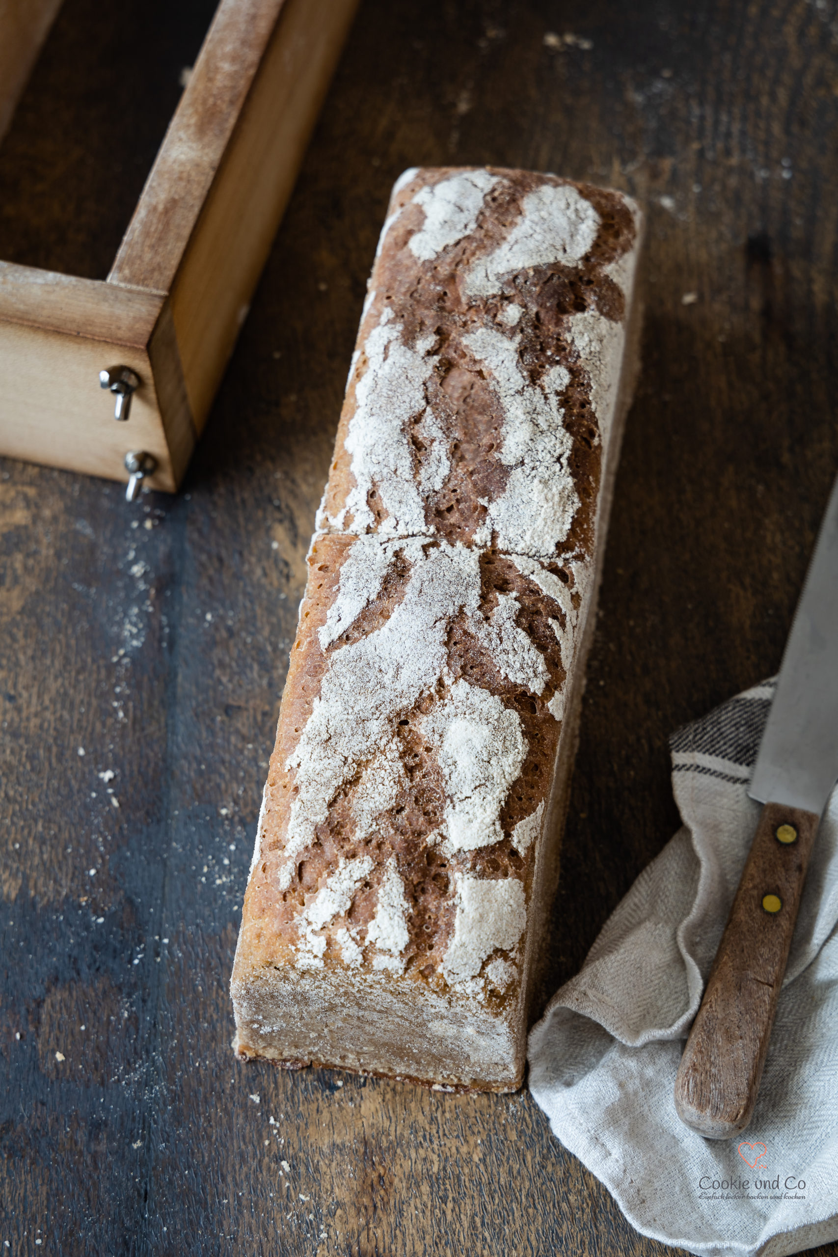 - In den vorgeheizten Ofen geben und wenig schwaden. Nach 5 Minuten Schwaden ablassen und die Temperatur auf 210 °C (190 °C Heißluft/Umluft) senken. Im Holzbackrahmen beträgt die Backzeit je nach Ofen 60–70 Minuten. (Kastenform etwa 55–60 Minuten, 2 kleine Formen etwa 45–50 Minuten.)