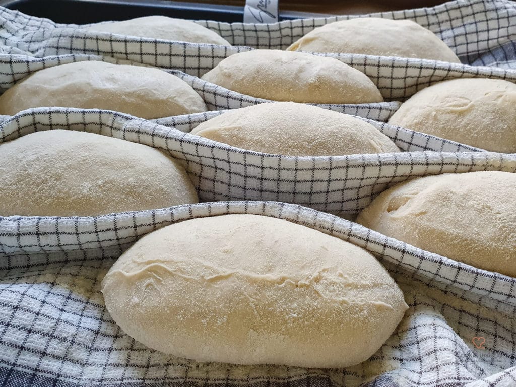 - Mit dem Schluss nach oben in ein Bäckerleinen / Geschirrtuch legen und den Stoff zwischen den Teiglingen etwas hochziehen, damit diese leicht gestützt werden.