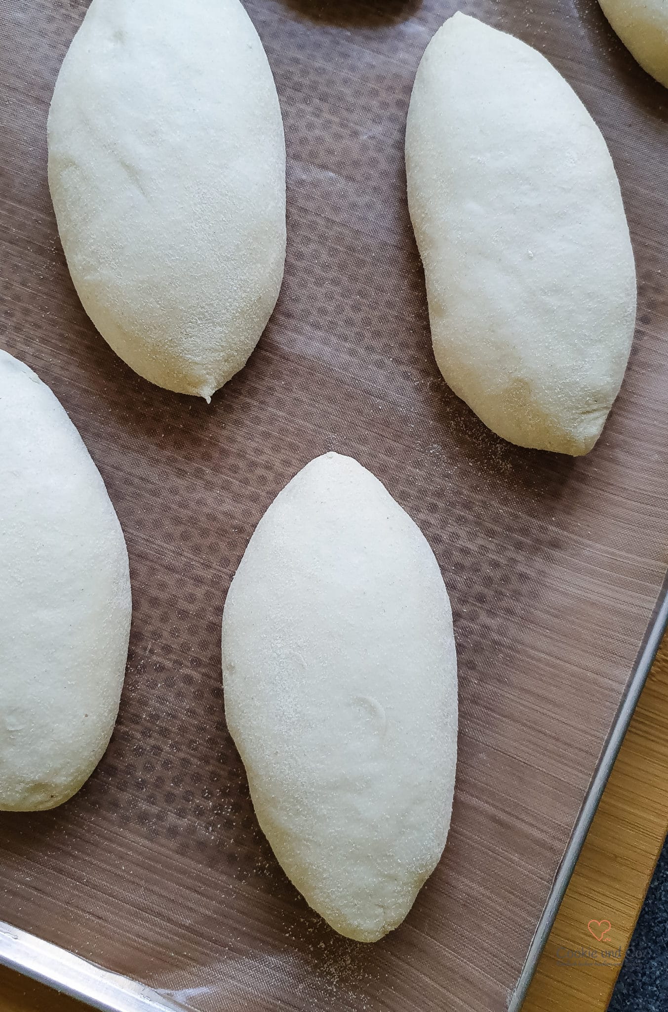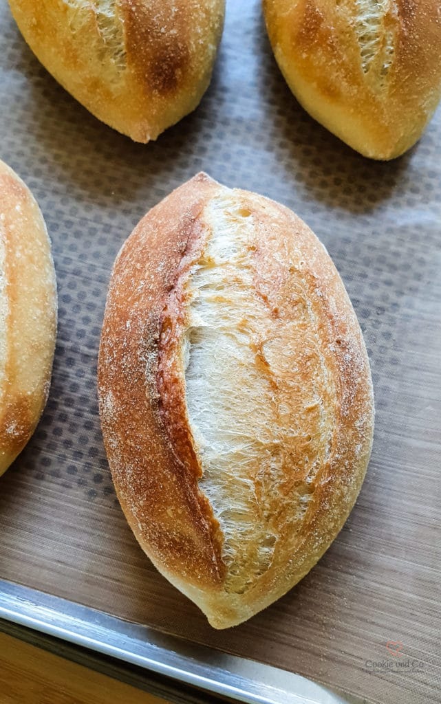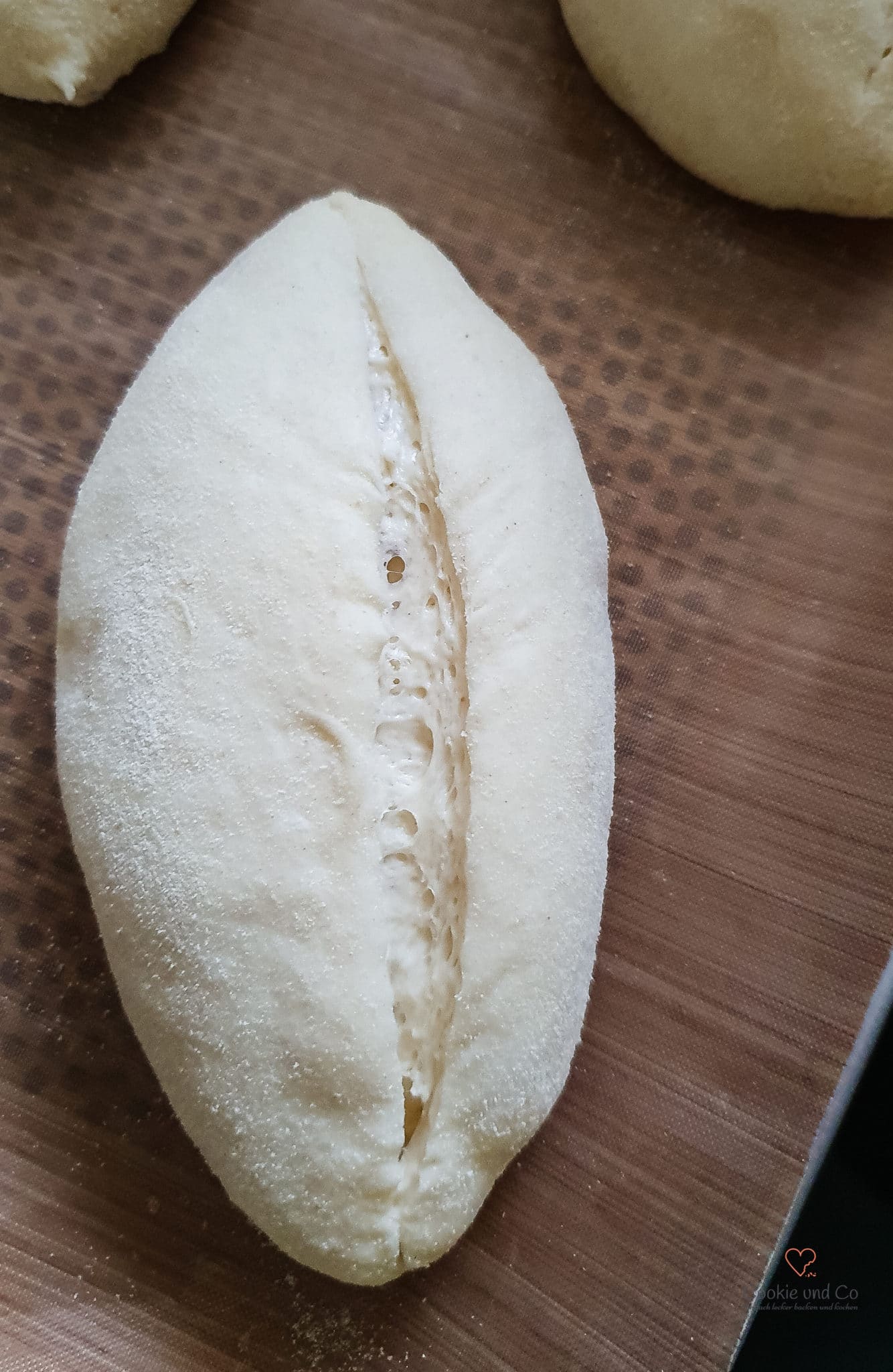 - Unmittelbar vor dem Backen die Teiglinge einmal längs einschneiden (Schluss unten).