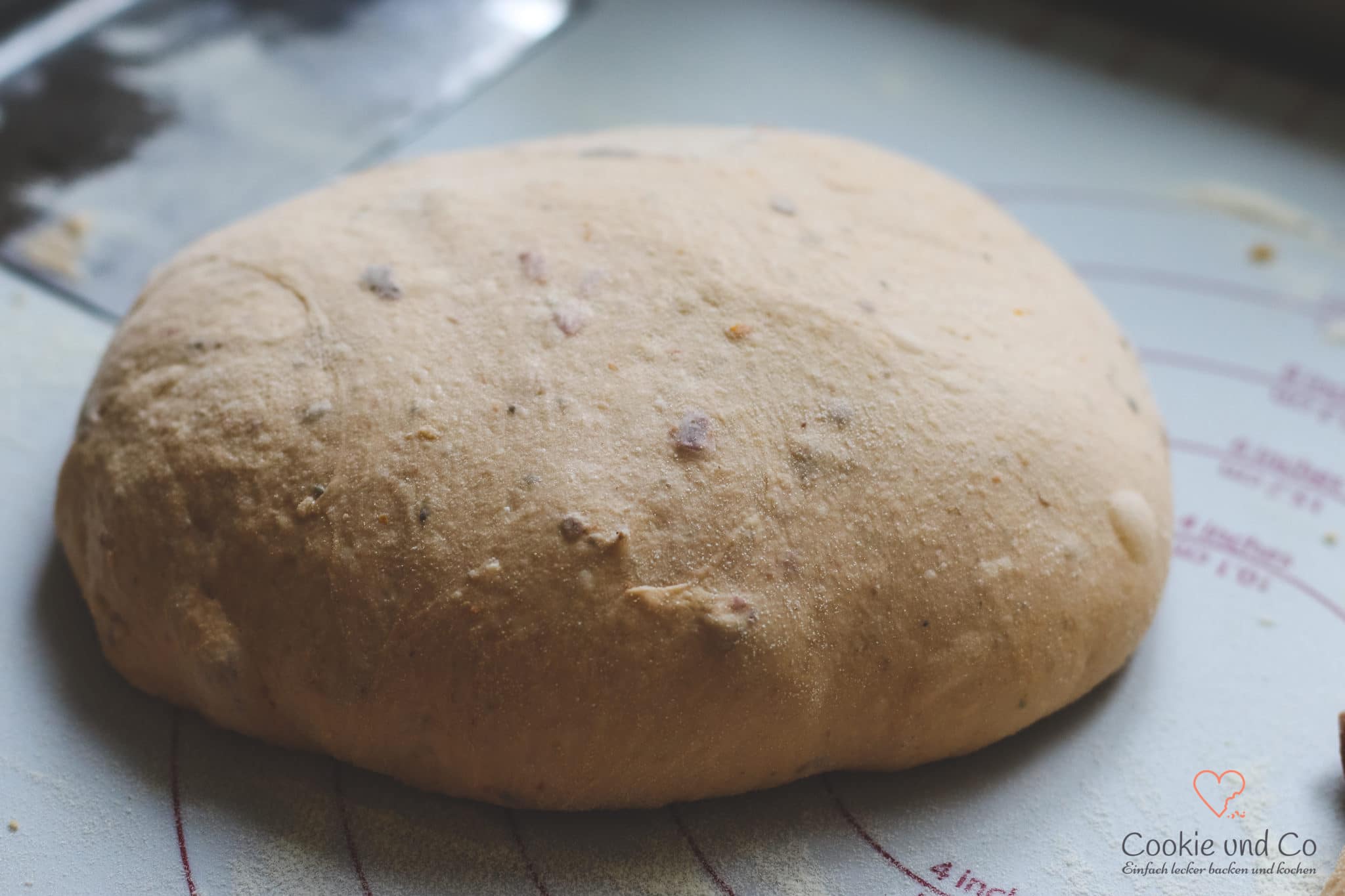 - Zum Schluss die abgetropften Tomaten und Pinienkerne kurz mit der Hand oder schonend bei langsamer Geschwindigkeit unter kneten.