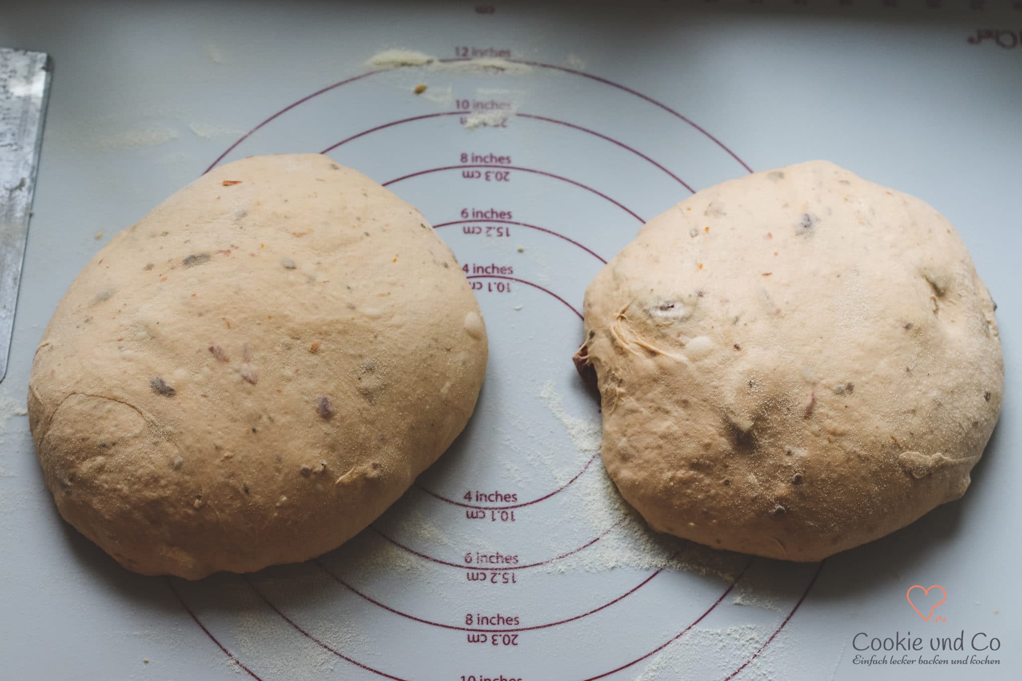 - Den Teig auf der bemehlten Arbeitsfläche (ich: Semola) schonend zu einem oder zwei kleinen Brotlaib(en) formen.