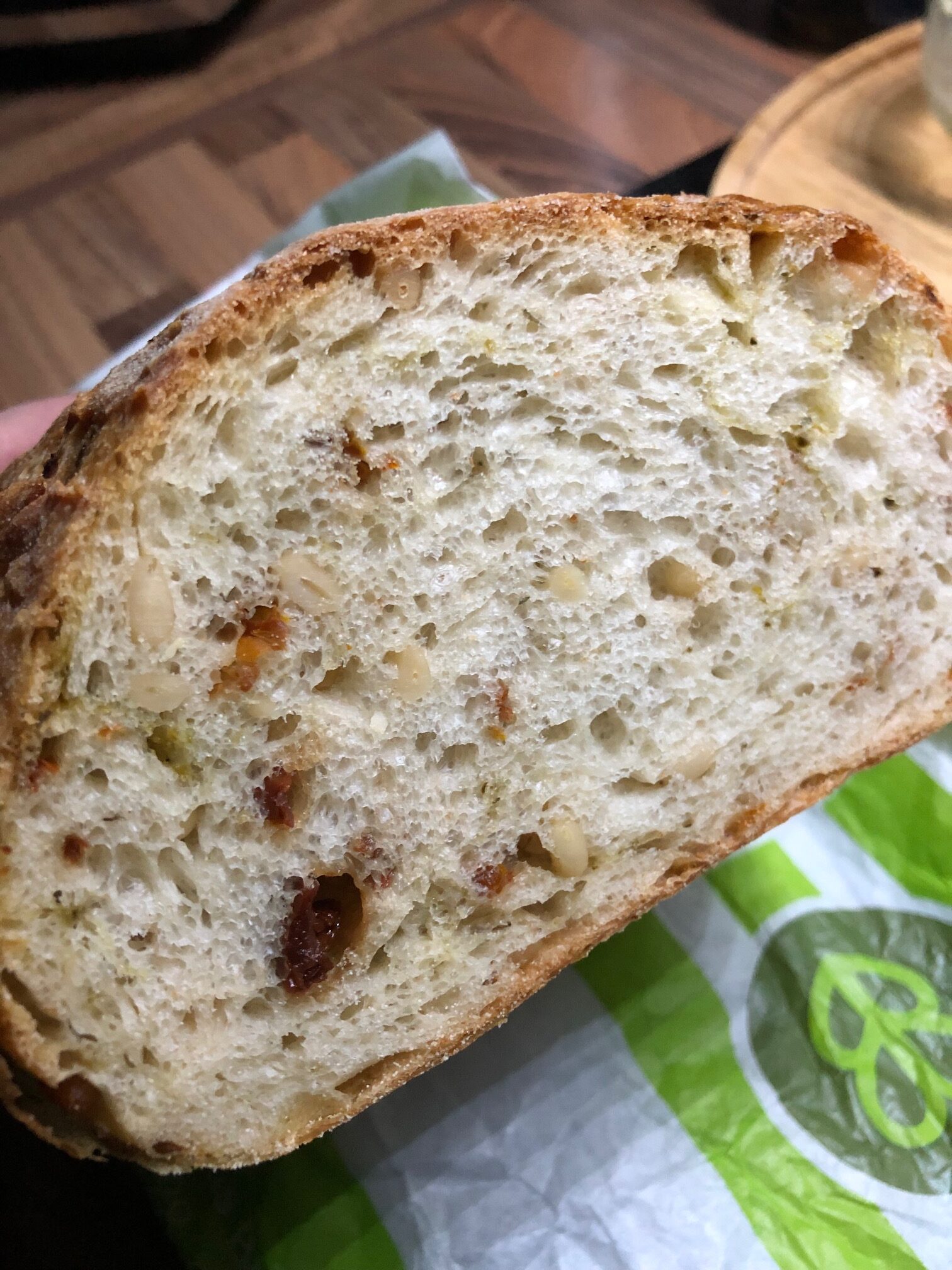 Das Brot ist sehr gut gelungen. Mit den Pinienkernen darin geschmacklich eine neue Dimension. Statt Tomatenpesto habe ich Basilikumpesto beim Dehnen und Falten mit eingearbeitet. Gibt es bestimmt wieder.