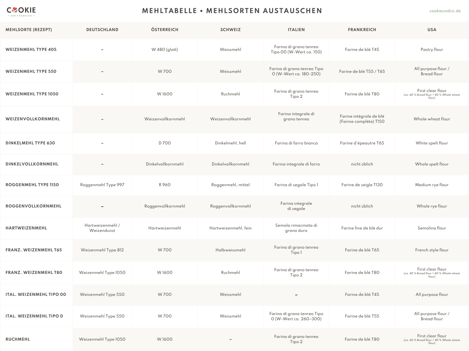 Die nachfolgenden Mehltabellen sollen dir eine praktische Hilfe beim Austauschen von verschiedenen Mehlen beim Backen sein. Sie bilden nicht den korrekt vergleichbaren Ausmahlungsgrad ab. Wichtiger Hinweis: Die Wasseraufnahme der Mehle kann unterschiedlich ausfallen. Es kann also sein, dass du weniger oder auch mehr als im Rezept angegeben benötigst, um die gewünschte Teigkonsistenz zu erreichen.