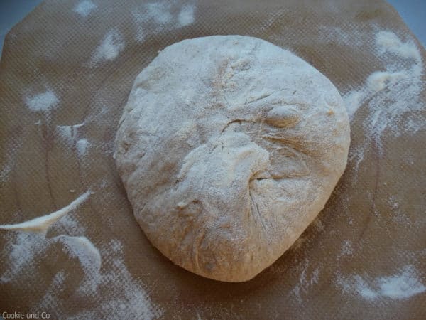- So gut es geht ein paar mal mit einer Teigkarte oder mit angefeuchteten Händen von außen zur Mitte falten, bis ein einiger maßen runder Teigling entstanden ist und etwas Spannung bekommen hat. (Gegebenenfalls das Backpapier wieder bemehlen zwischendurch, sonst klebt der Teig eventuell an.)