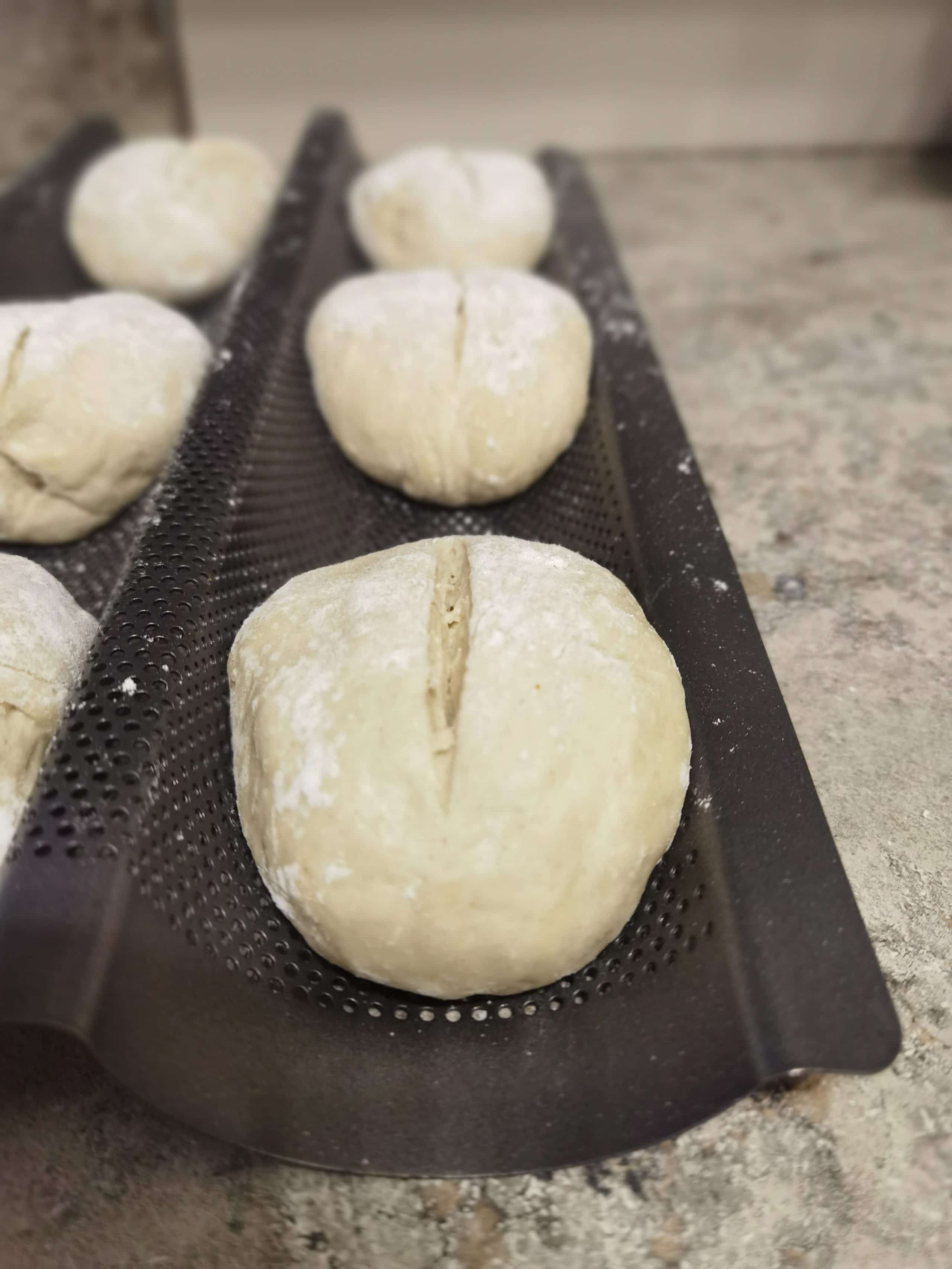 - Brötchen-Form: Die Teiglinge umdrehen und auf eine Dauerbackfolie / Backpapier verteilen. (Damit können die Teiglinge prima auf den heißen Backstahl/ Blech geschoben werden.) Bei den Schnittbrötchen die Teiglinge einmal längs einschneiden.