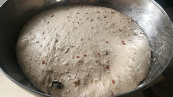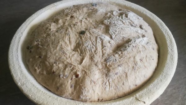 - Den Teig insgesamt 16–17 Stunden stehen lassen. Wenn er gut aufgegangen ist, dann wirken und im Garkörbchen 45–60 Minuten gehen lassen.