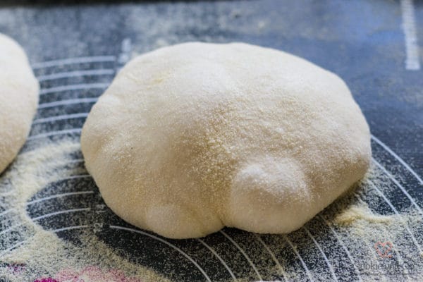 - Nach der Gehzeit die Arbeitsfläche gut Hartweizengrieß bestreuen und den Teig mit Hilfe eines Teigschabers auf die bemehlte Arbeitsfläche gleiten lassen.