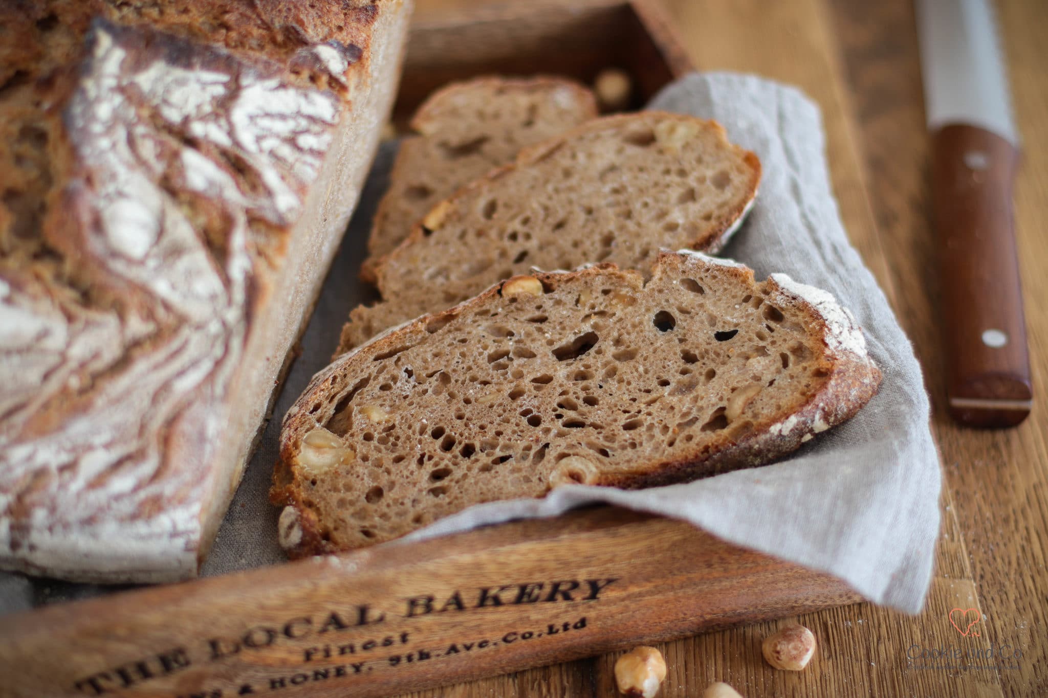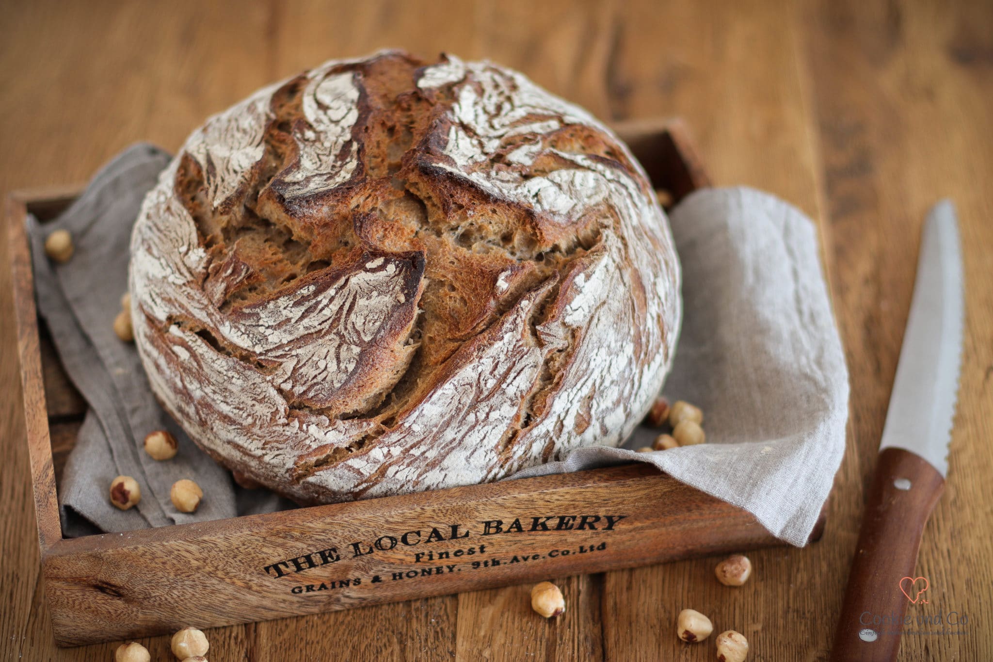 Ich habe die Haselnüsse durch Walnüsse ersetzt, und das Ruchmehl durch Dinkelmehl und nicht im Topf gebacken, sondern auf Stein.