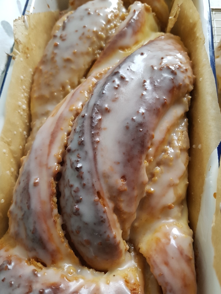 Damit der Zuckerguss schön glänzend bleibt kann man erst Aprikotur auf den heißen Zopf streichen und nach dem Abkühlen dann den Zuckerguss.