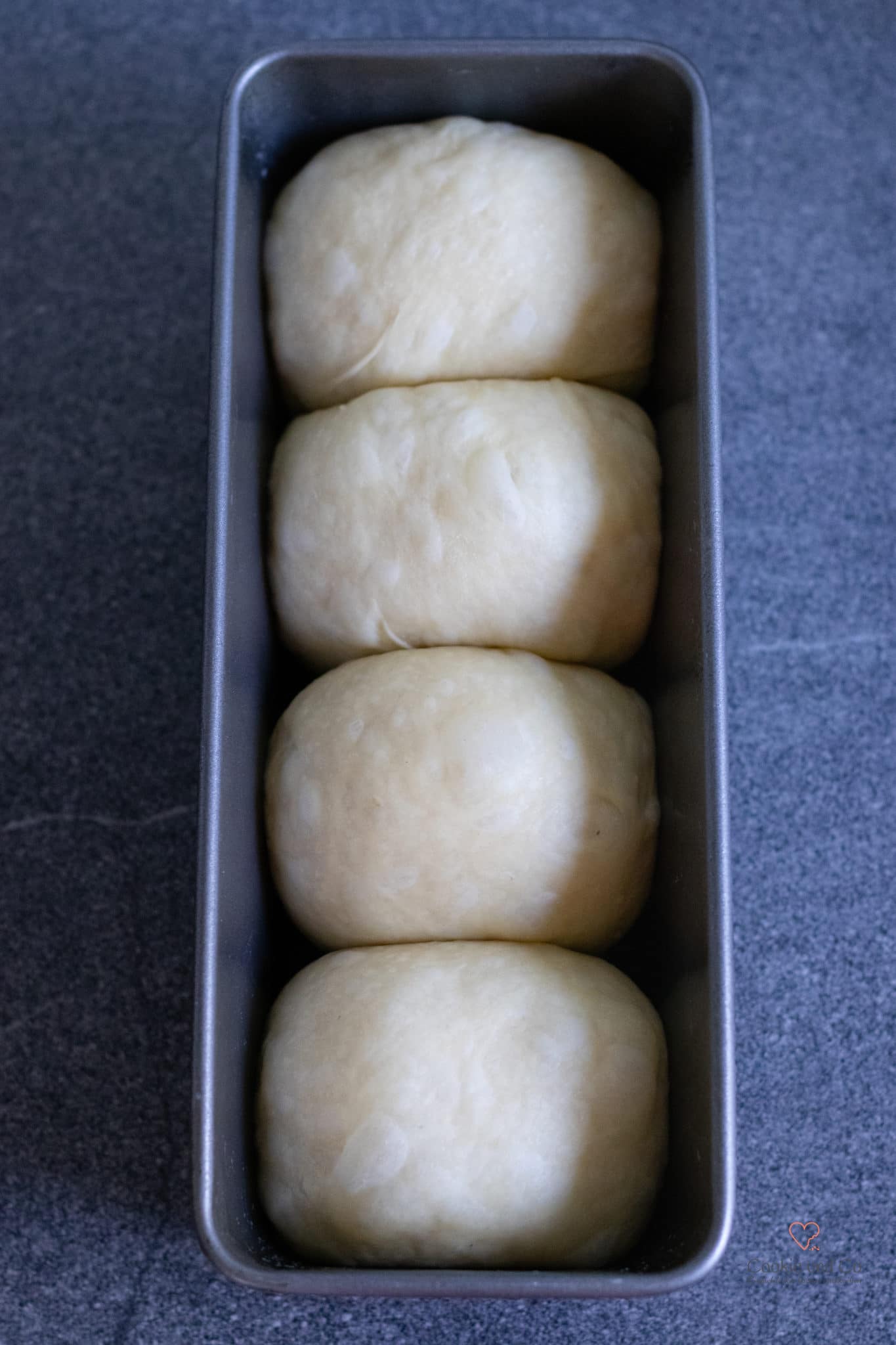 - Schonend rund formen und in eine große gefettete und leicht bemehlte Kastenform (mind. 30 x 12 cm) setzen.