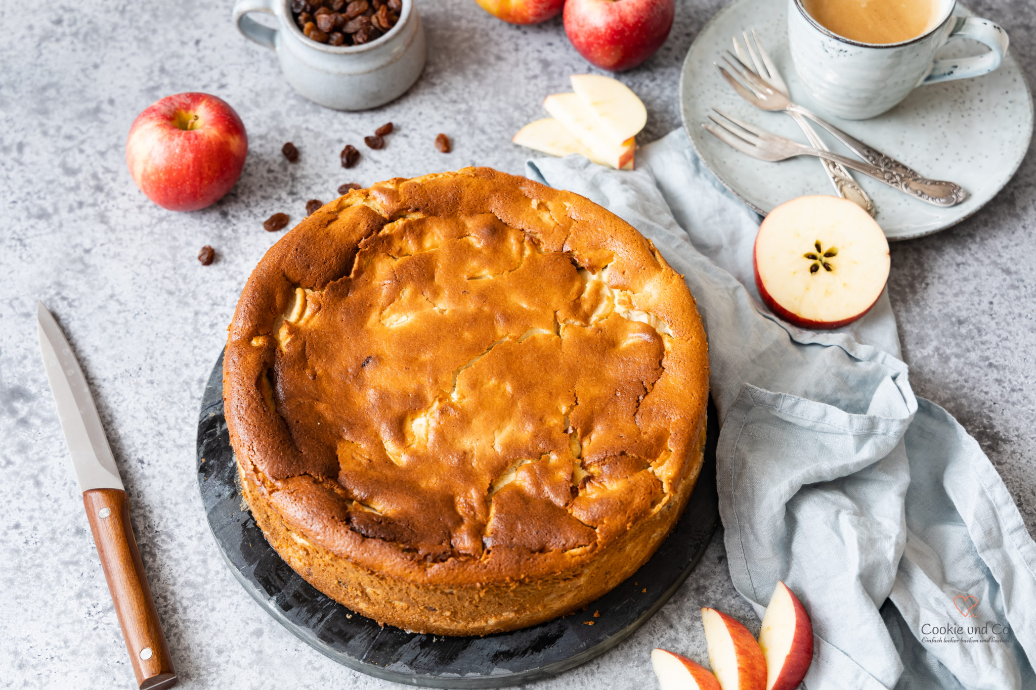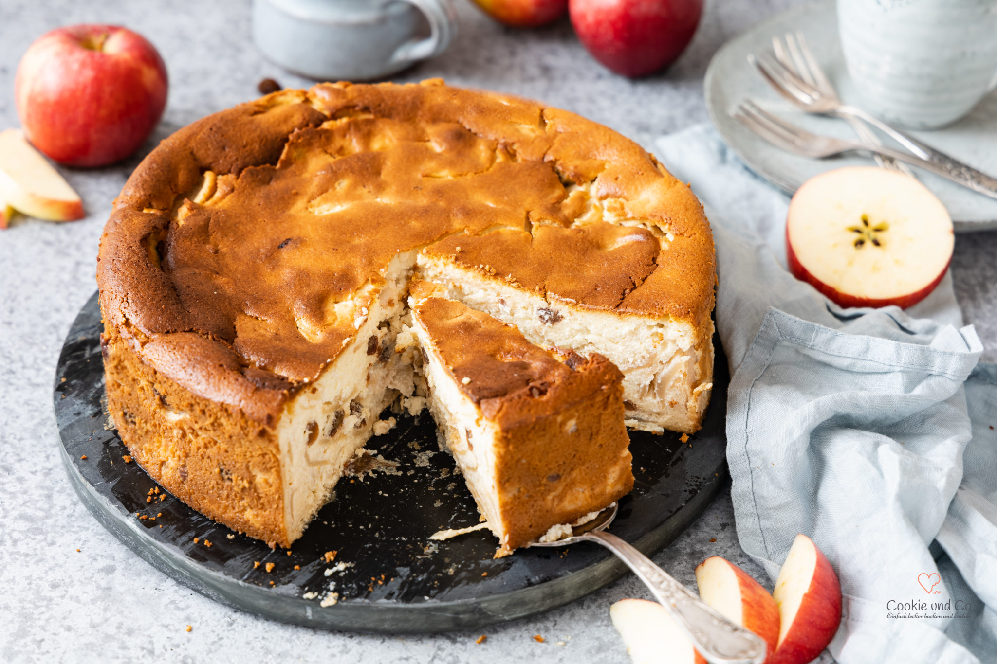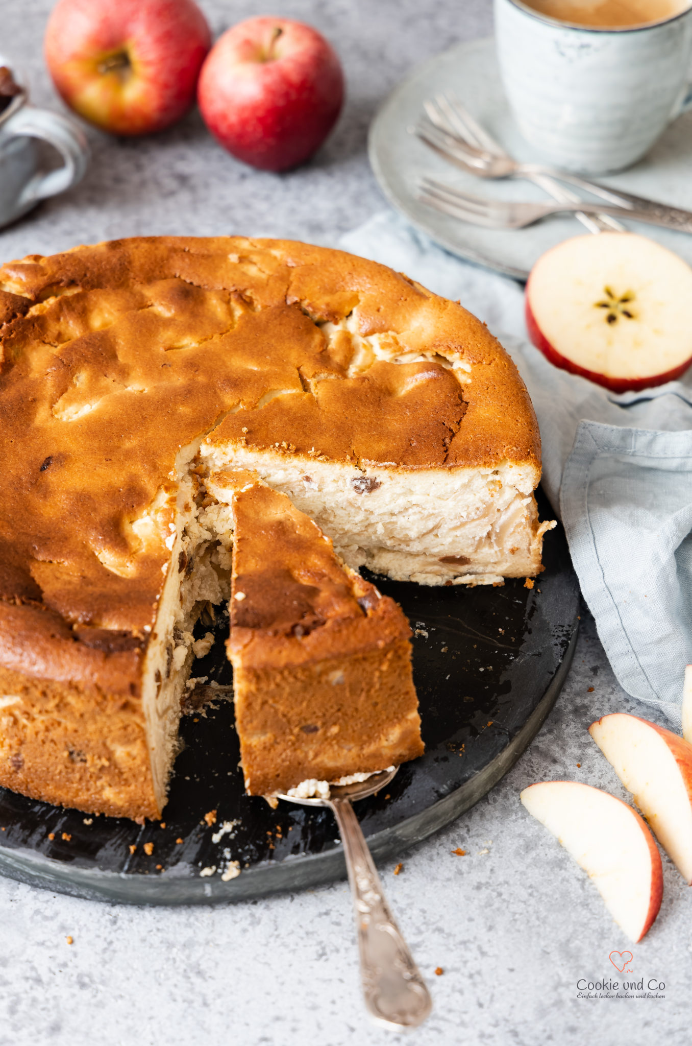 Im Rezept habe ich dafür eine Stunde angegeben. Diese Zeit solltest du deinem Kuchen Apfel-Quark-Kuchen im ausgeschalteten Backofen auf jeden Fall noch schenken. Besser wäre sogar noch länger. Ich habe nach der besagten Stunde die Ofentür einen Spalt aufgemacht und den Kuchen noch für eine weitere Stunde in der Restwärme stehen gelassen. Danach kann er bei Raumtemperatur weiter abkühlen. Anschließend am besten ab damit in den Kühlschrank. Also ein Kuchen, der sich wunderbar vorbereiten lässt und durchgekühlt sehr gut schmeckt. Außer du gehörst zu jener Fraktion, die unbedingt jeden Käsekuchen noch lauwarm kosten muss. Dann sollte der Kuchen aber zumindest soweit abgekühlt sein, dass er nicht mehr zu weich ist und genug Stand hat. Und übrigens: Wenn du keine Rosinen magst, lass‘ sie einfach weg oder tausche sie gegen Cranberries aus…♥